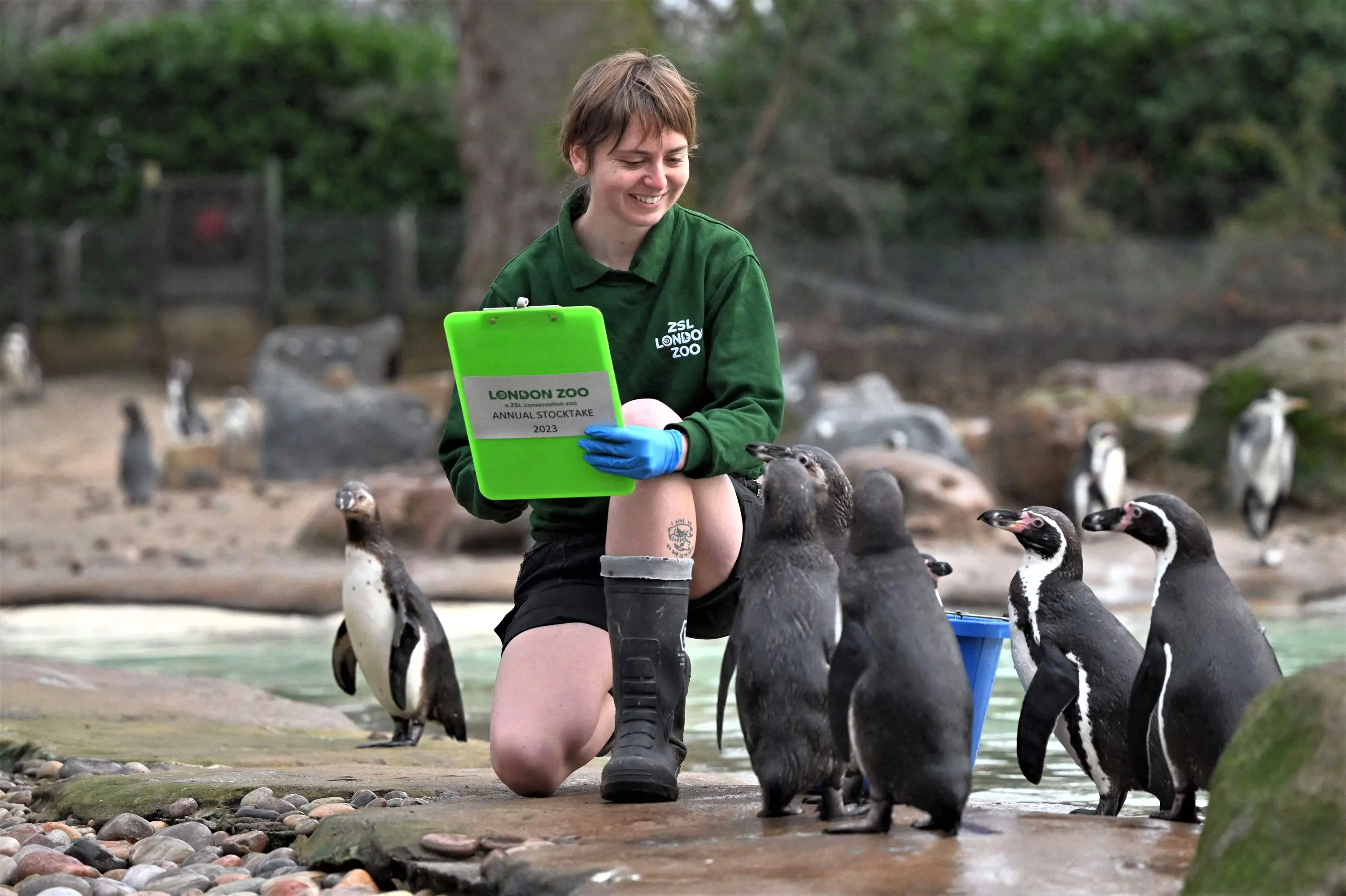 A zookeeper counts penguins during the annual stocktake at ZSL London Zoo in central London on January 3, 2023. (Photo by Justin Tallis/AFP Photo)