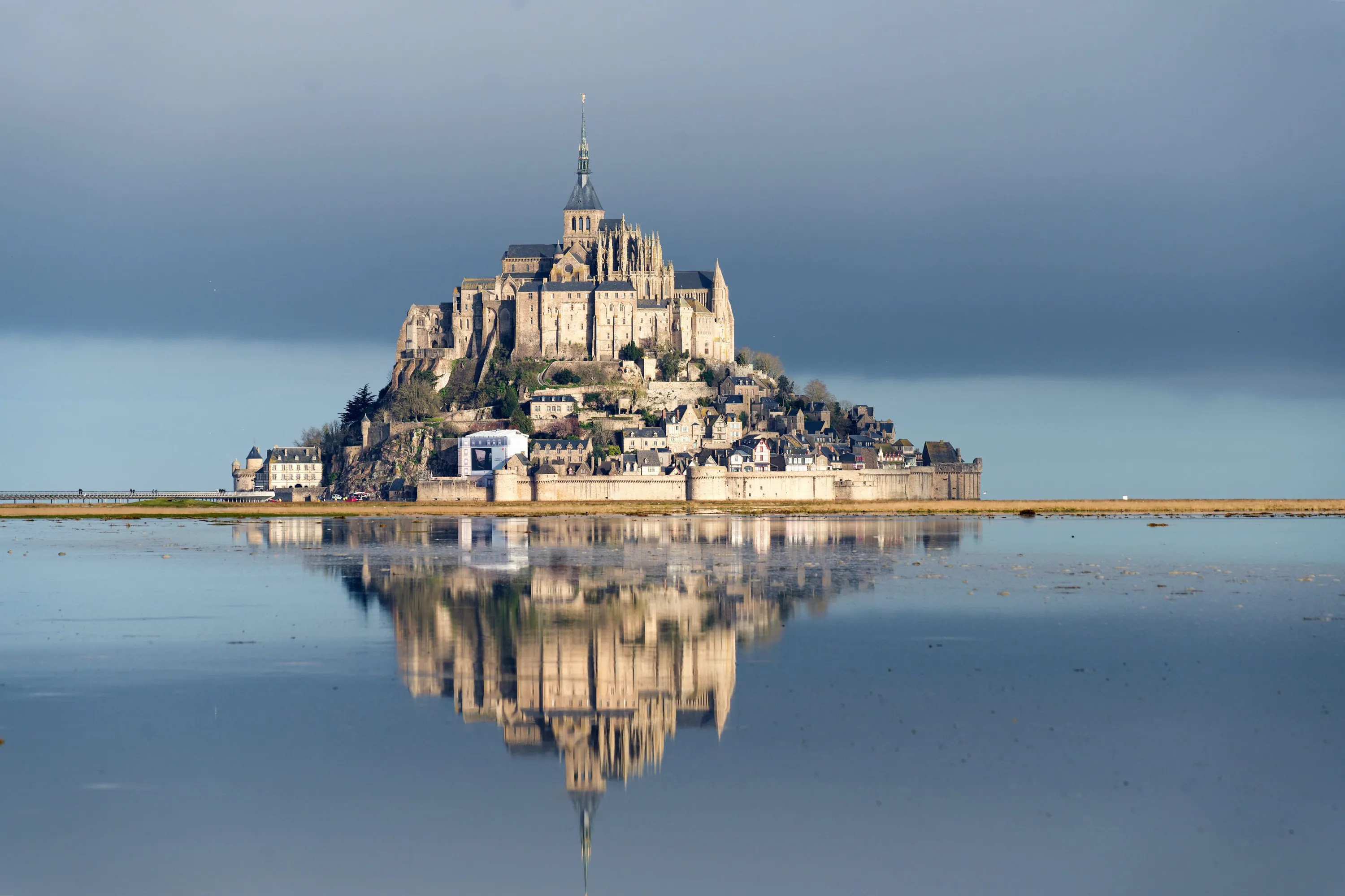 Mont St Michel – a granite tidal island off the Normandy coast – is the site of an 11th-century Benedictine abbey, seen here at high tide in the first decade of March 2024. (Photo by Jean-Michel Niester/Media Drum Images)
