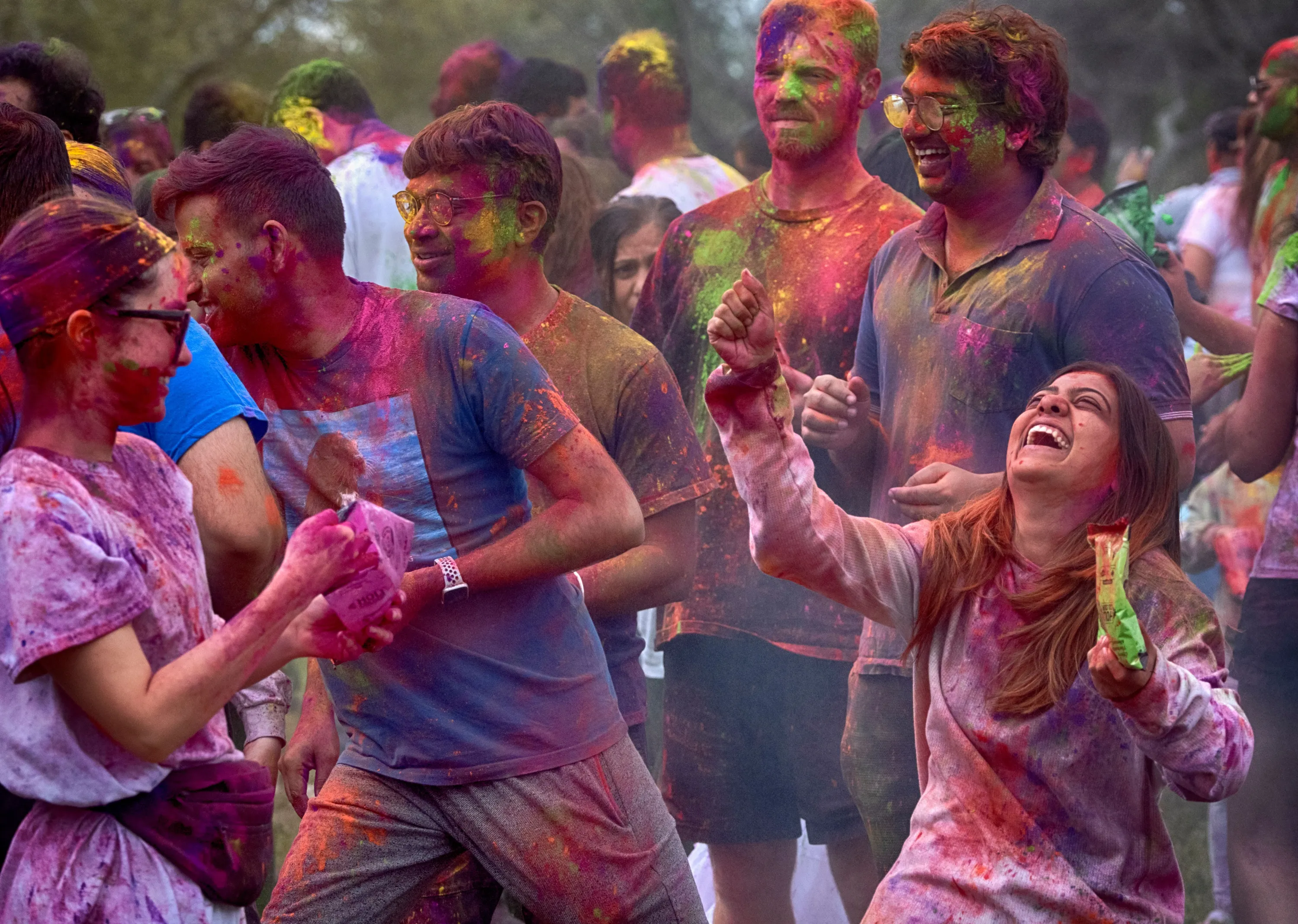 Devotees dance and throw colored powder as they celebrate Holi, the Hindu festival of colors, in the Encino section of Los Angeles on Sunday, March 24, 2024. (AP Photo/Richard Vogel)