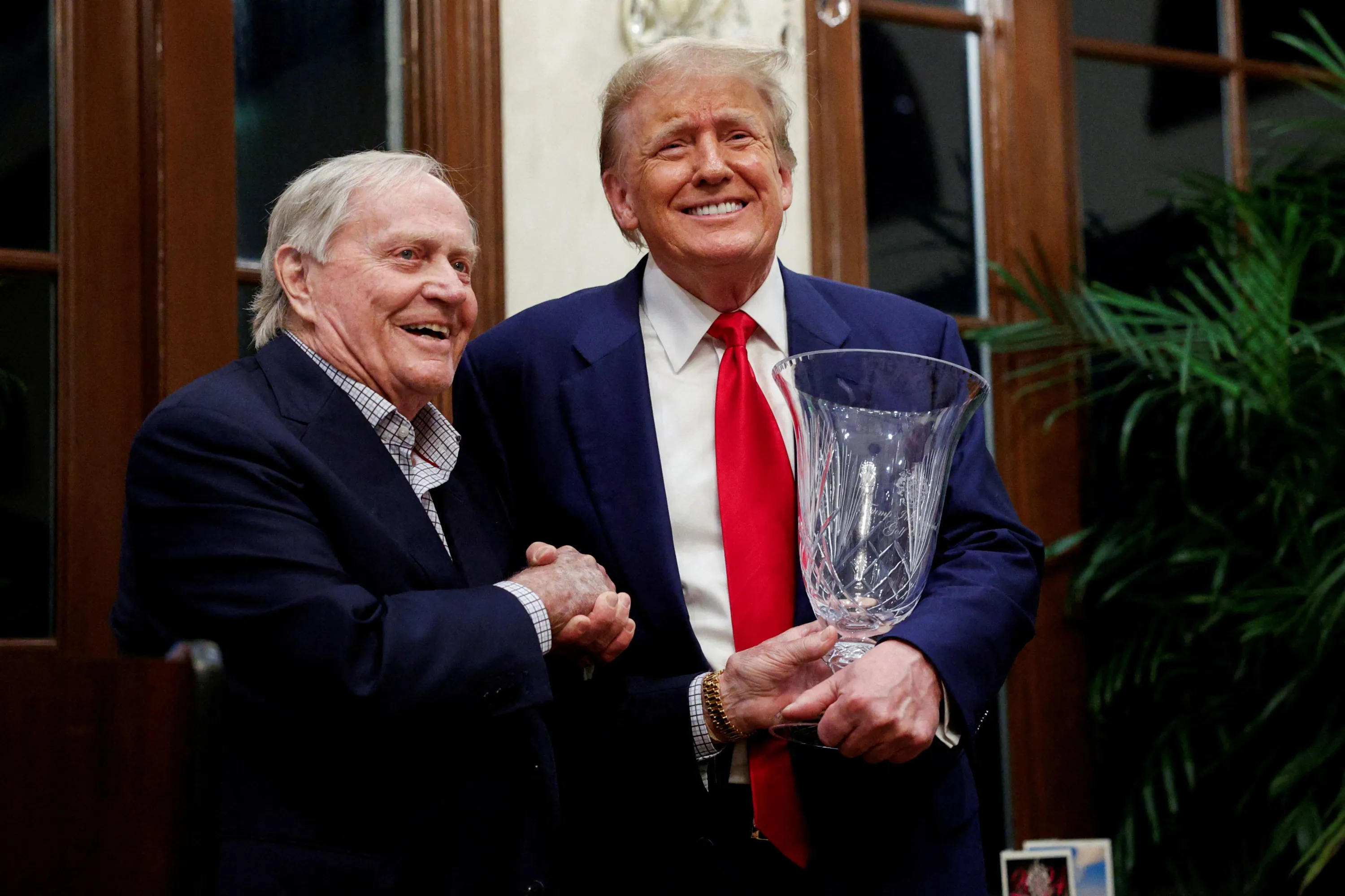 Republican presidential candidate and former U.S. President Donald Trump receives a trophy as the Most Improved Player from Jack Nicklaus, a retired American professional golfer, during the 2024 Senior Club Championship award ceremony at his Trump International Golf Club in West Palm Beach, Florida on March 25, 2024. (Photo by Marco Bello/Reuters)