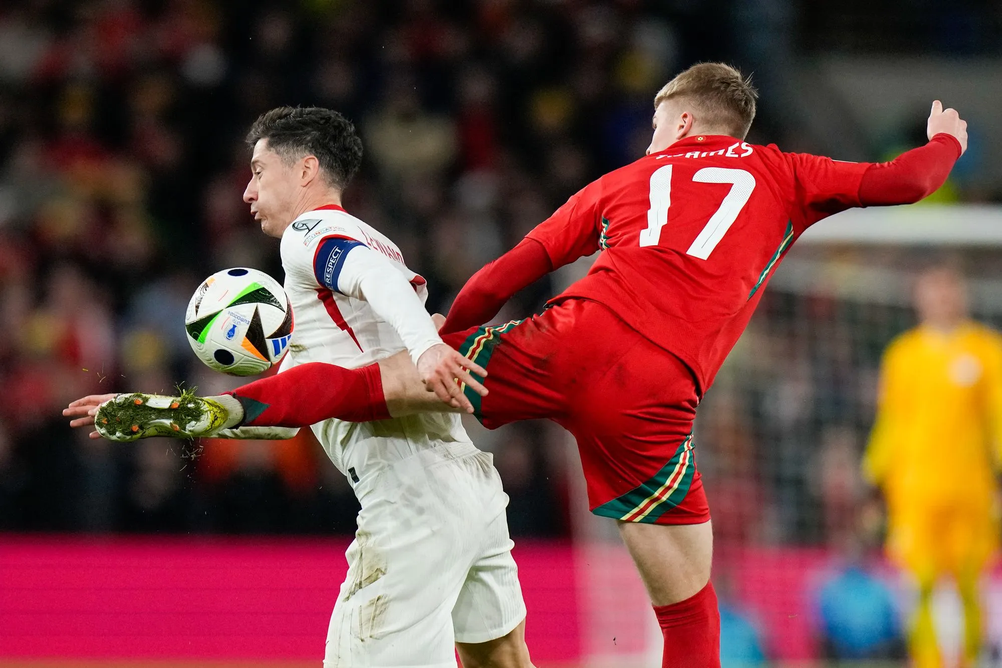 Wales Jordan James, right, and Poland's Robert Lewandowski battle for the ball during Euro 2024 soccer play-off match between Wales and Poland at Cardiff City Stadium, Wales, Tuesday, March 26, 2024. (Photo by Alastair Grant/AP Photo)