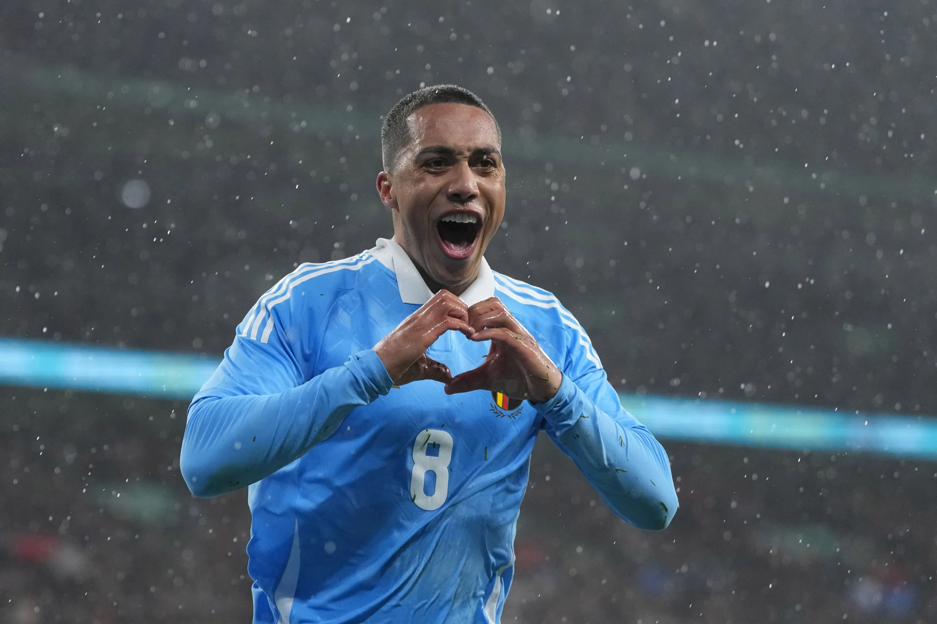 Belgium's Youri Tielemans celebrates after scoring his side's second goal during an international friendly soccer match between England and Belgium at Wembley Stadium, in London, Tuesday, March 26, 2024. (Photo by Kirsty Wigglesworth/AP Photo)