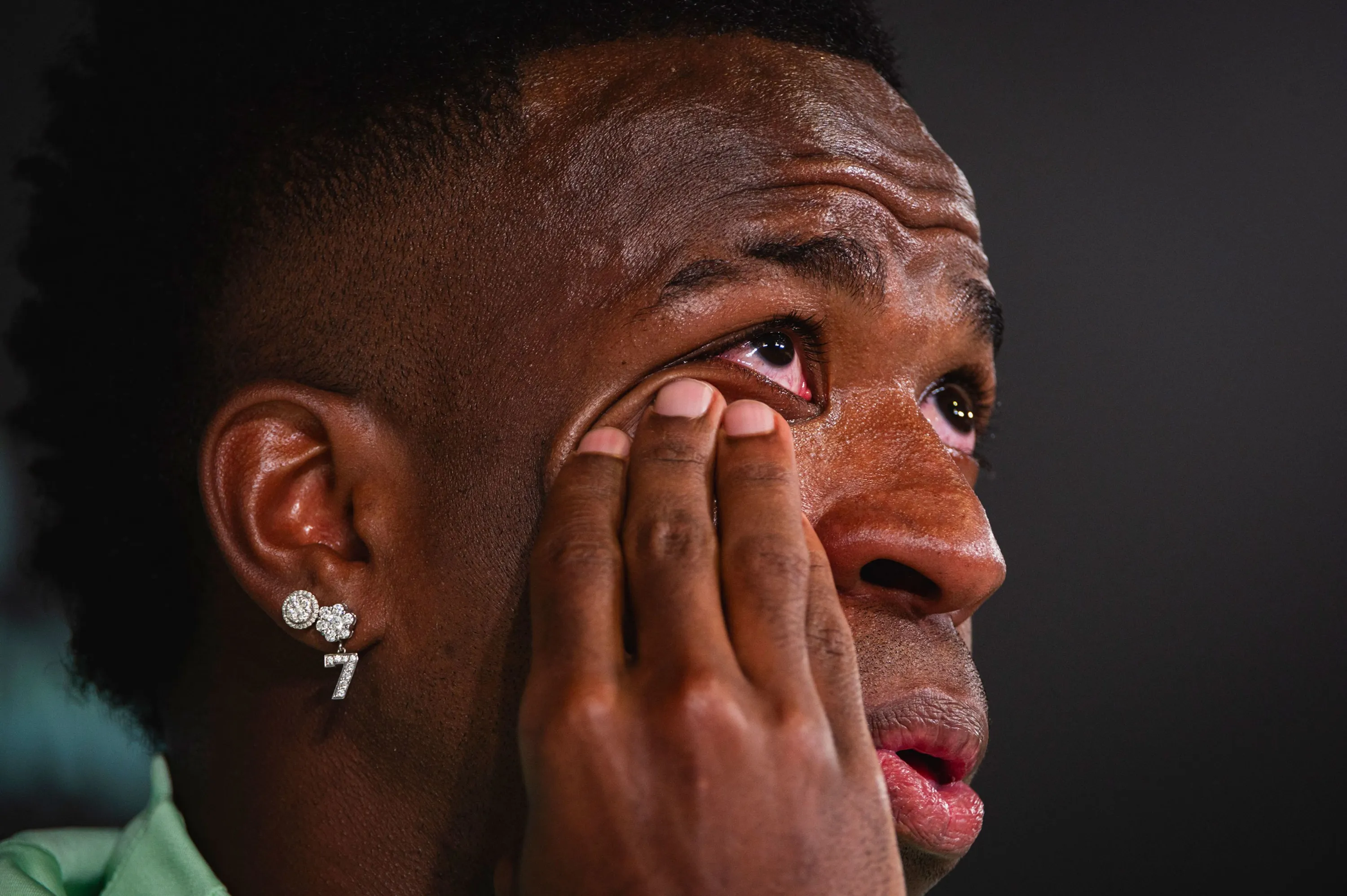 Vinicius Junior of Brazil cries while talking about racism during the press conference ahead of the friendly match between Spain and Brazil at Estadio Alfredo Di Stefano on March 25, 2024 in Madrid, Spain. (Photo by Alberto Gardin/Eurasia Sport Images/Getty Images)