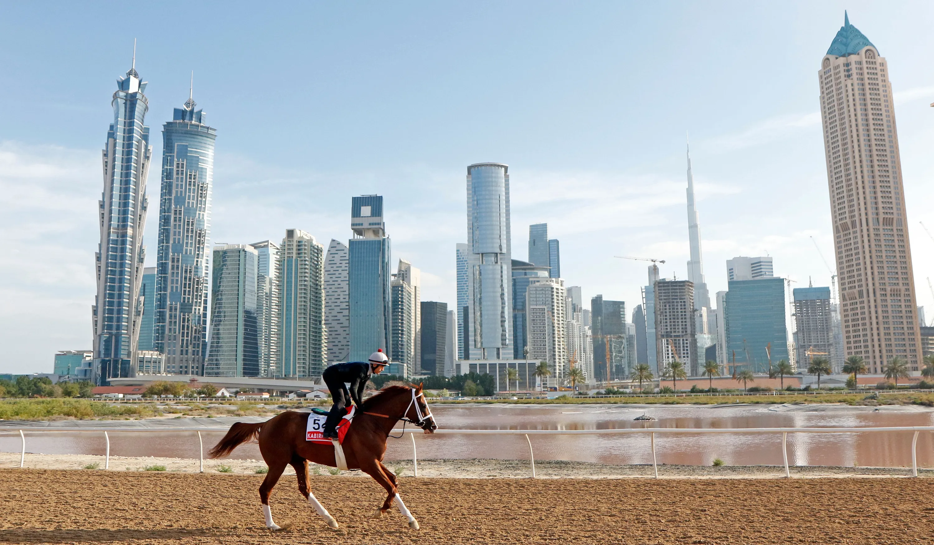 A jockey takes Kabirkhan, a rising star, along the Al Quoz training track on March 27, 2024 to prepare for the Dubai World Cup on Saturday. (Photo by Steven Cargill/racingfotos.com/Rex Features/Shutterstock)