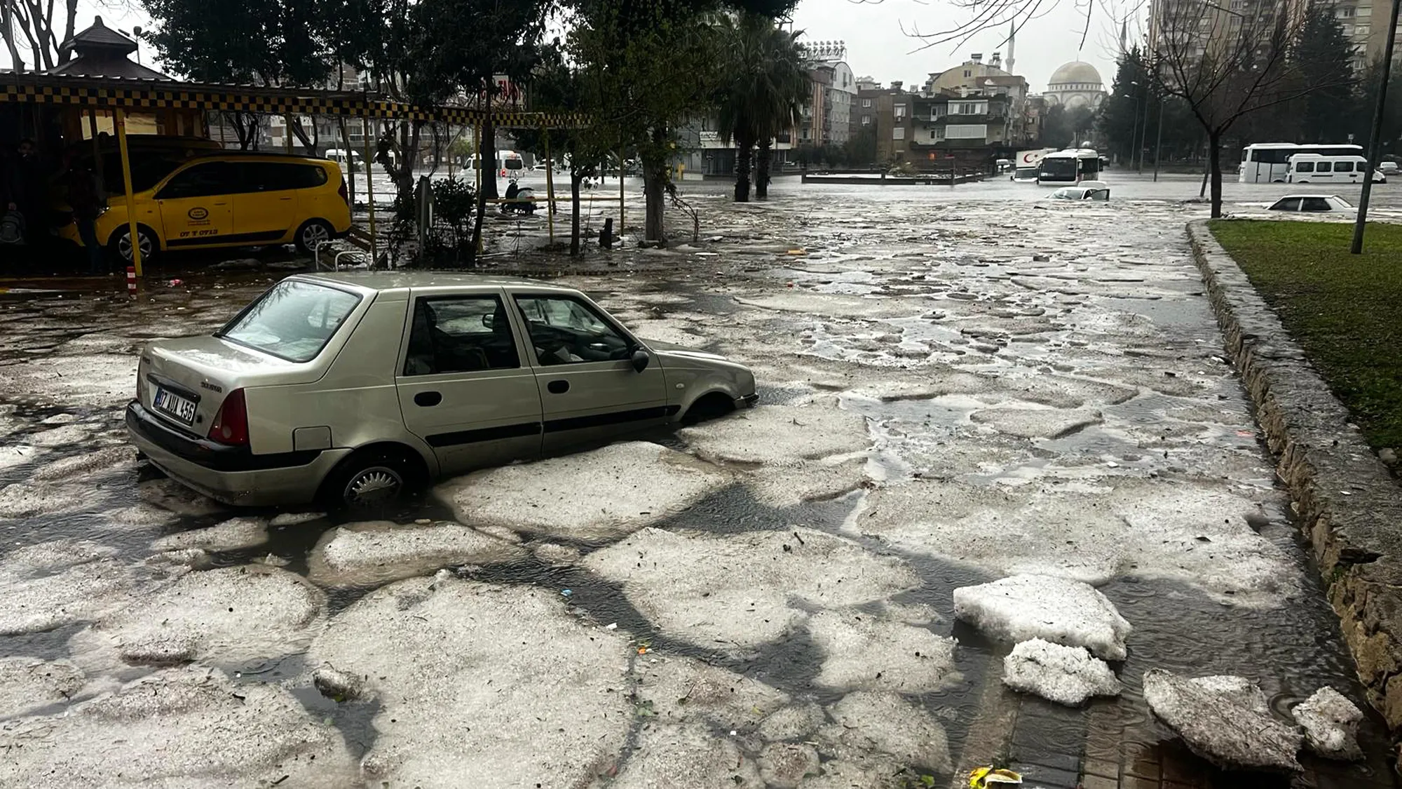 Vehicles are stranded during floods after heavy rains in Antalya, southern Turkey, Tuesday, February 13, 2024. (Photo by Dia Images via AP Photo)