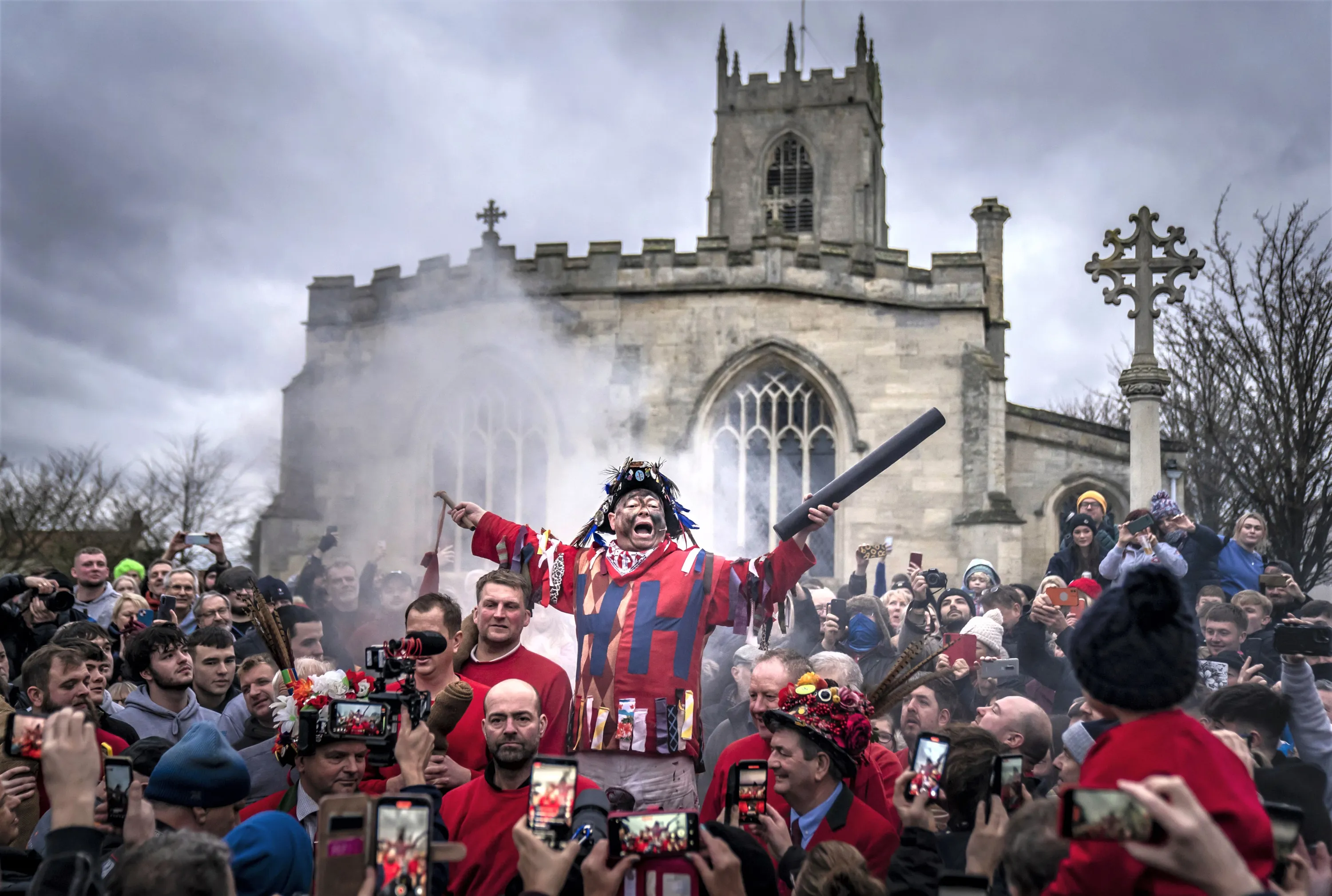The ceremonial fool,James Chatwin, delivers a speech during the Smoking the Fool, as he starts the Haxey Hood, an ancient tradition dating back to the 14th Century in the village of Haxey in North Lincolnshire on Friday, January 6, 2023. Teams representing pubs from two local villages, Haxey and Westwoodside, compete to win the hood – a leather tube – for their pub landlord. The hood is thrown into the crowd and swayed forward towards the pubs – which are known as the goals – without being kicked or thrown. The winning pub displays the hood until the next year. The game dates back to the 14th century when Lady De Mowbray dropped her hood and the locals chased after it. (Photo by Danny Lawson/PA Wire)