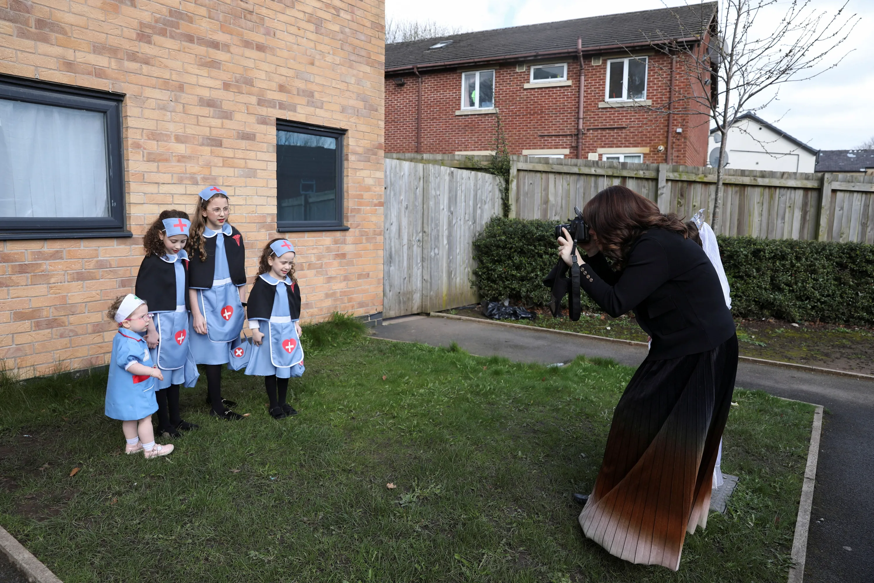 A woman takes a photograph of Jewish children dressed in costumes as they celebrate the annual holiday of Purim in Manchester, Britain on March 24, 2024. (Photo by Temilade Adelaja/Reuters)