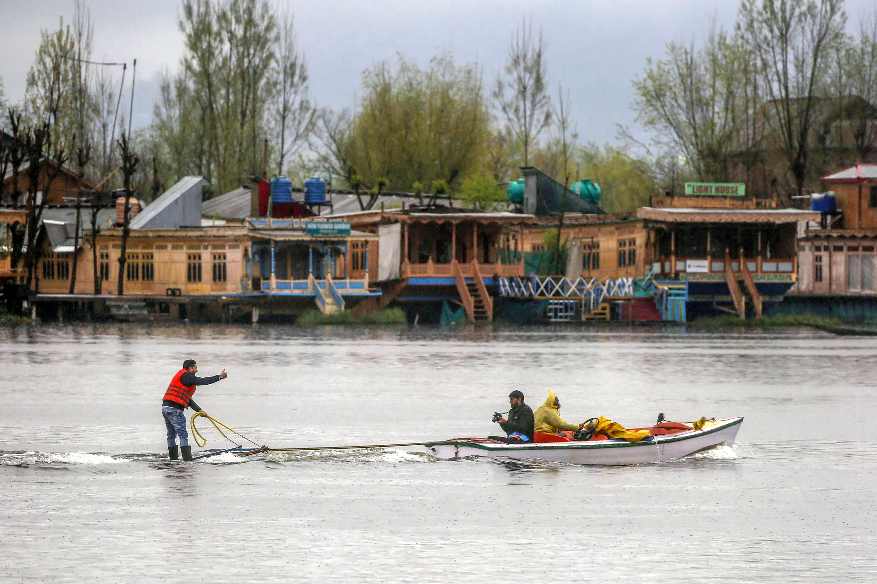 A tourist water-skis across the Dal Lake during rainfall in Srinagar, the summer capital of Indian Kashmir, 29 March 2024. Jammu and Kashmir Disaster Management Authority (JKDMA) on 29 March issued a medium-danger level avalanche warning for four districts of Kashmir division, likely to occur above 2400 meters over Kupwara, Bandipora, Baramulla and Ganderbal districts in next 24 hours, according to a JKDMA spokesperson. (Photo by Farooq Khan/EPA/EFE)