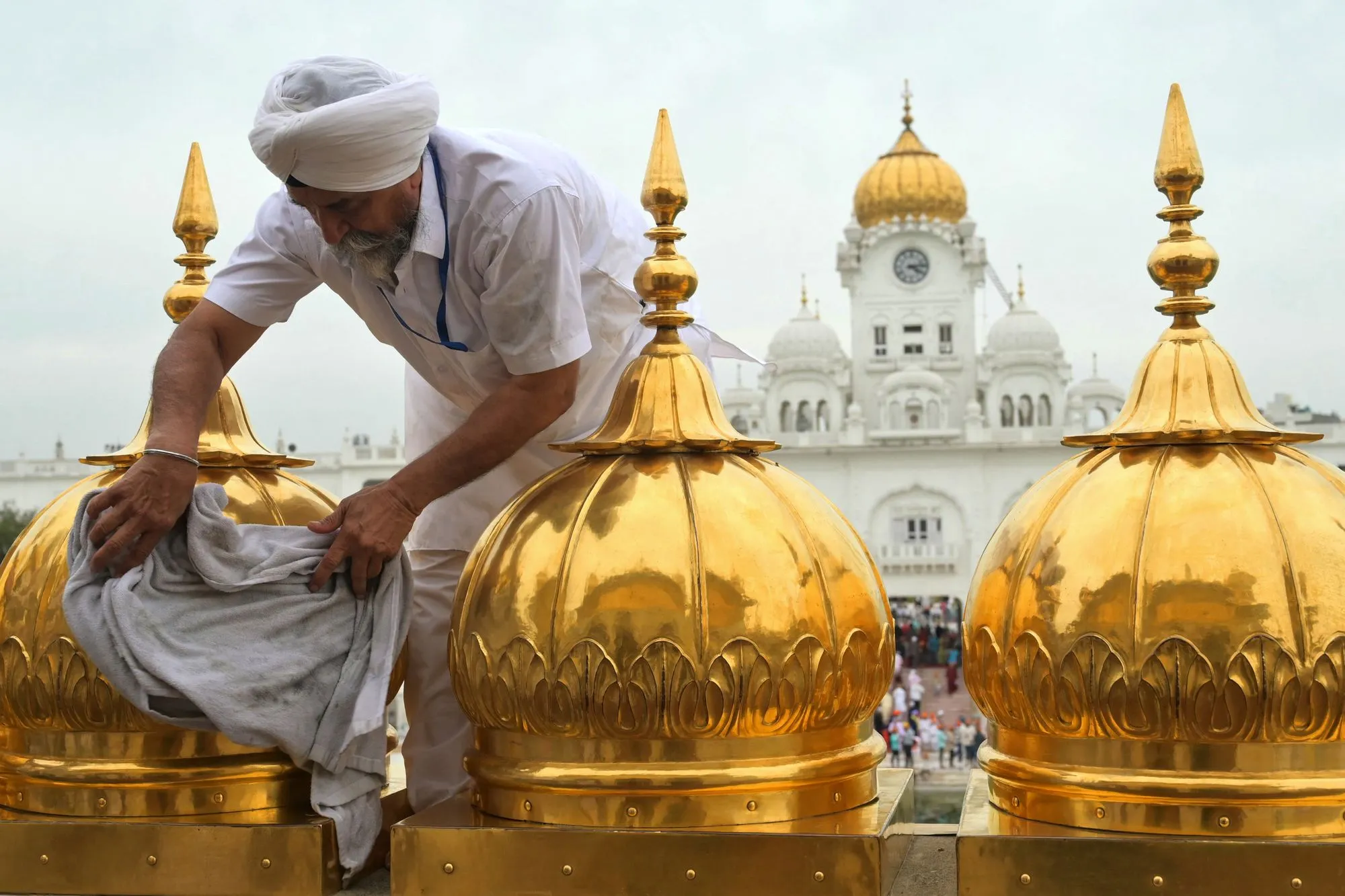 A Sikh volunteer of the Guru Nanak Nishkam Sewak Jatha (GNNSJ), a faith-based charitable organisation cleans gold platings at the Golden Temple in Amritsar on March 28, 2024. (Photo by Narinder Nanu/AFP Photo)