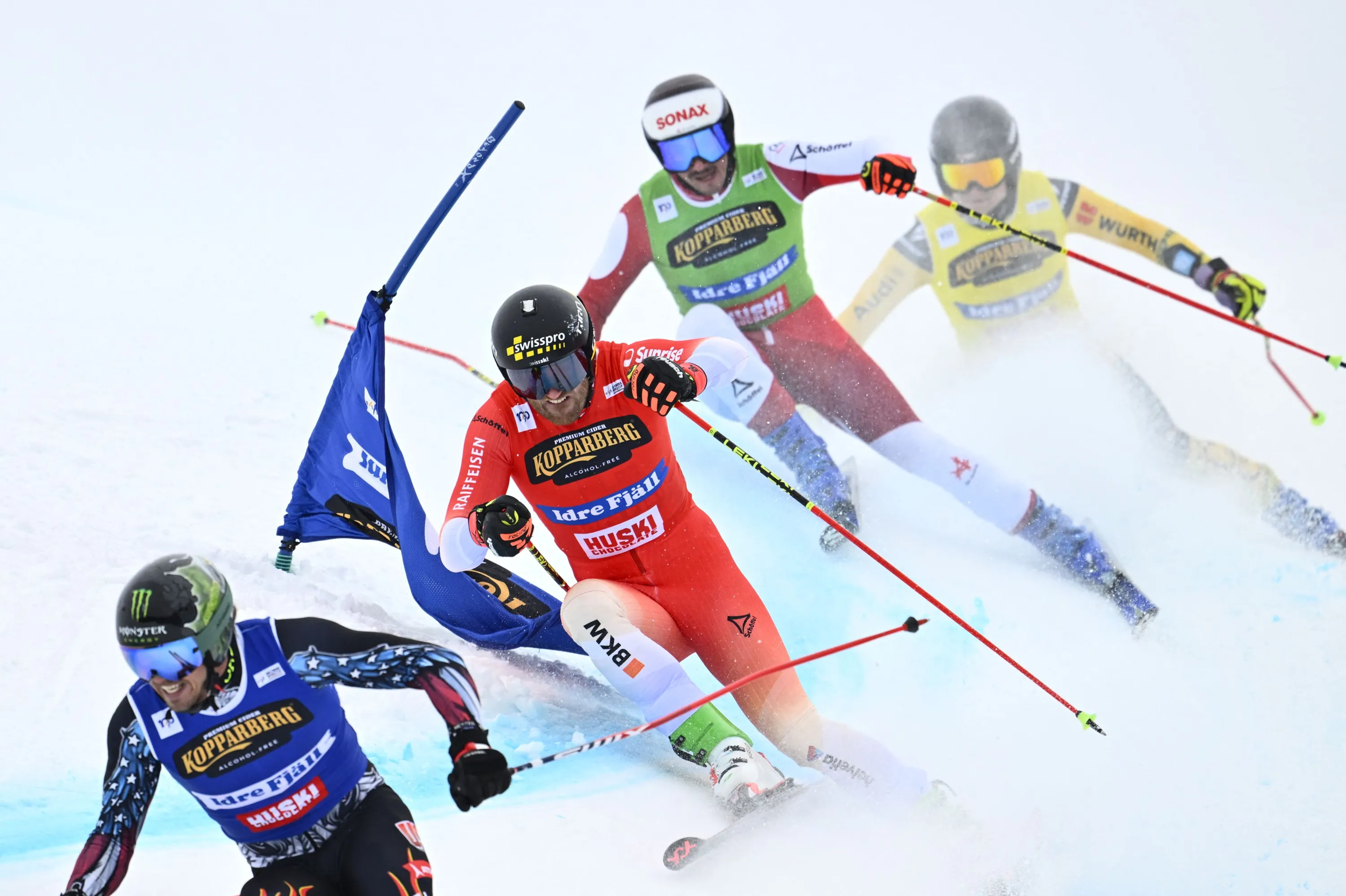 Switzerland's Alex Fiva (2nd R) and other athletes compete in the men's 1/8 final heat 4 during the FIS Men's Ski Cross World Cup competition at Idre Fjaell, Sweden, on March 23, 2024. (Photo by Anders Wiklund/TT News Agency via AFP Photo)