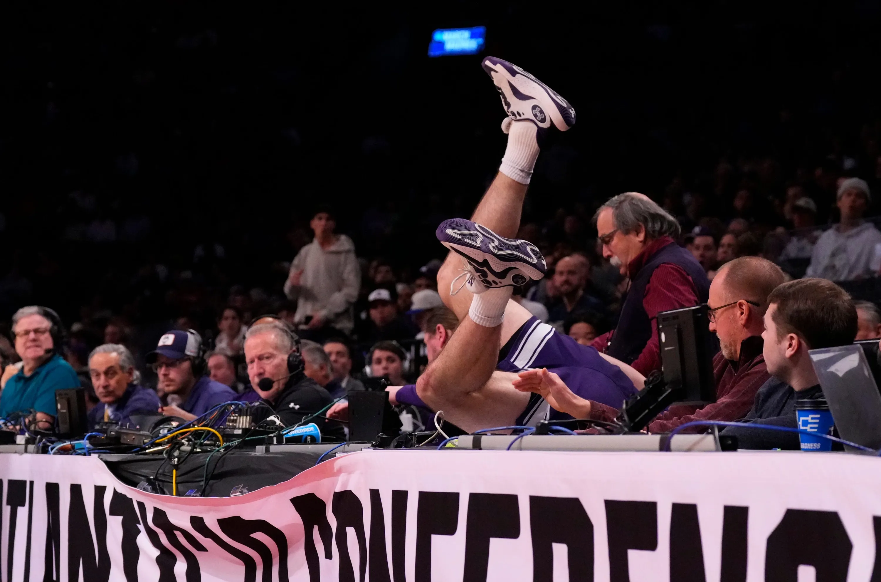 Northwestern Wildcats guard Brooks Barnhizer dives into the scorer's table against the Florida Atlantic Owls in the first round of the 2024 NCAA Tournament at the Barclays Center on March 22, 2024. (Photo by Robert Deutsch/USA TODAY Sports)