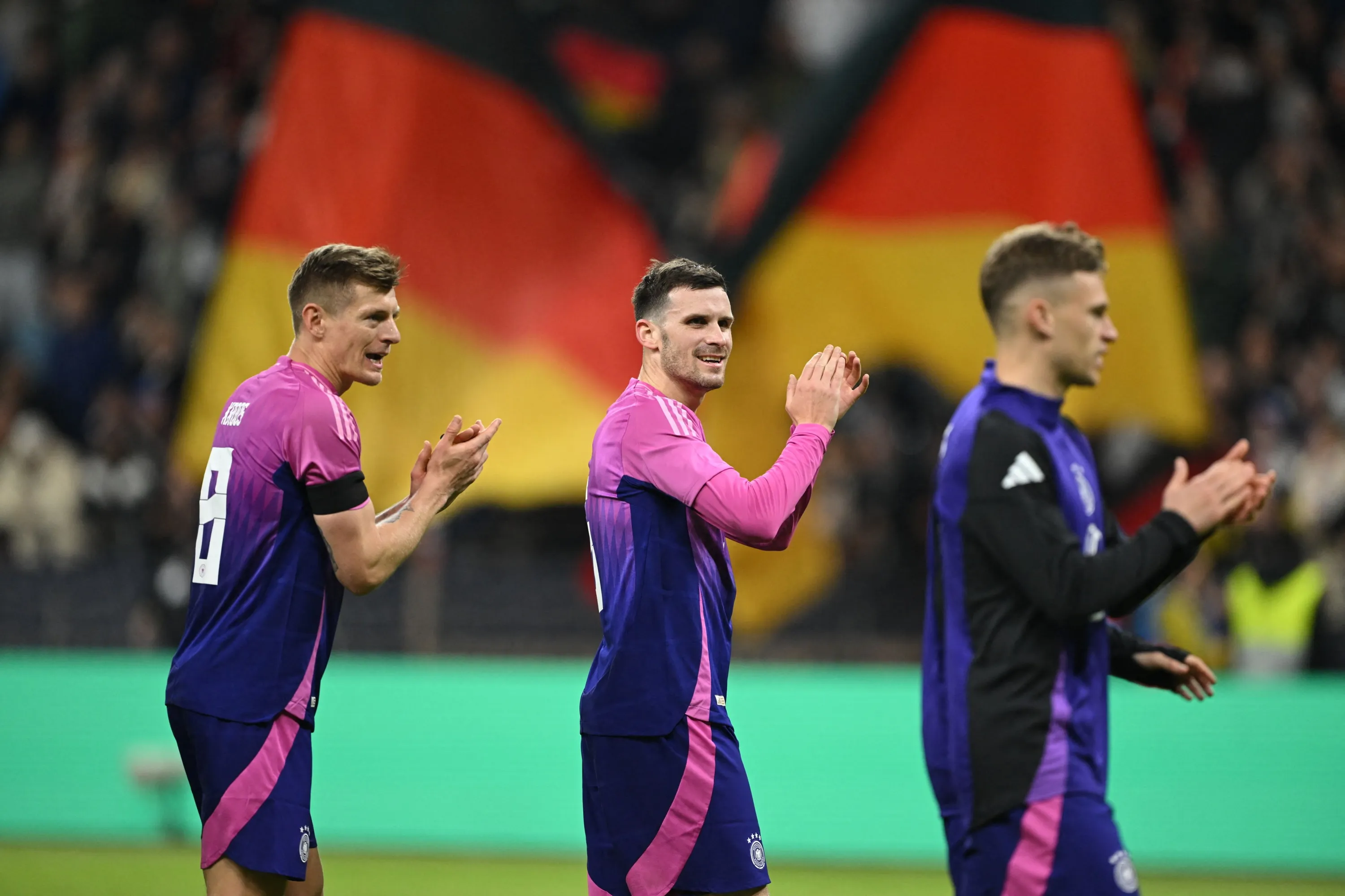 (L-R) Germany's midfielder #08 Toni Kroos, Germany's midfielder #05 Pascal Gross and Germany's midfielder #06 Joshua Kimmich clap hands to celebrate after winning the friendly football match between Germany and Netherlands in Frankfurt, western Germany, on March 26, 2024. (Photo by Ina Fassbender/AFP Photo)