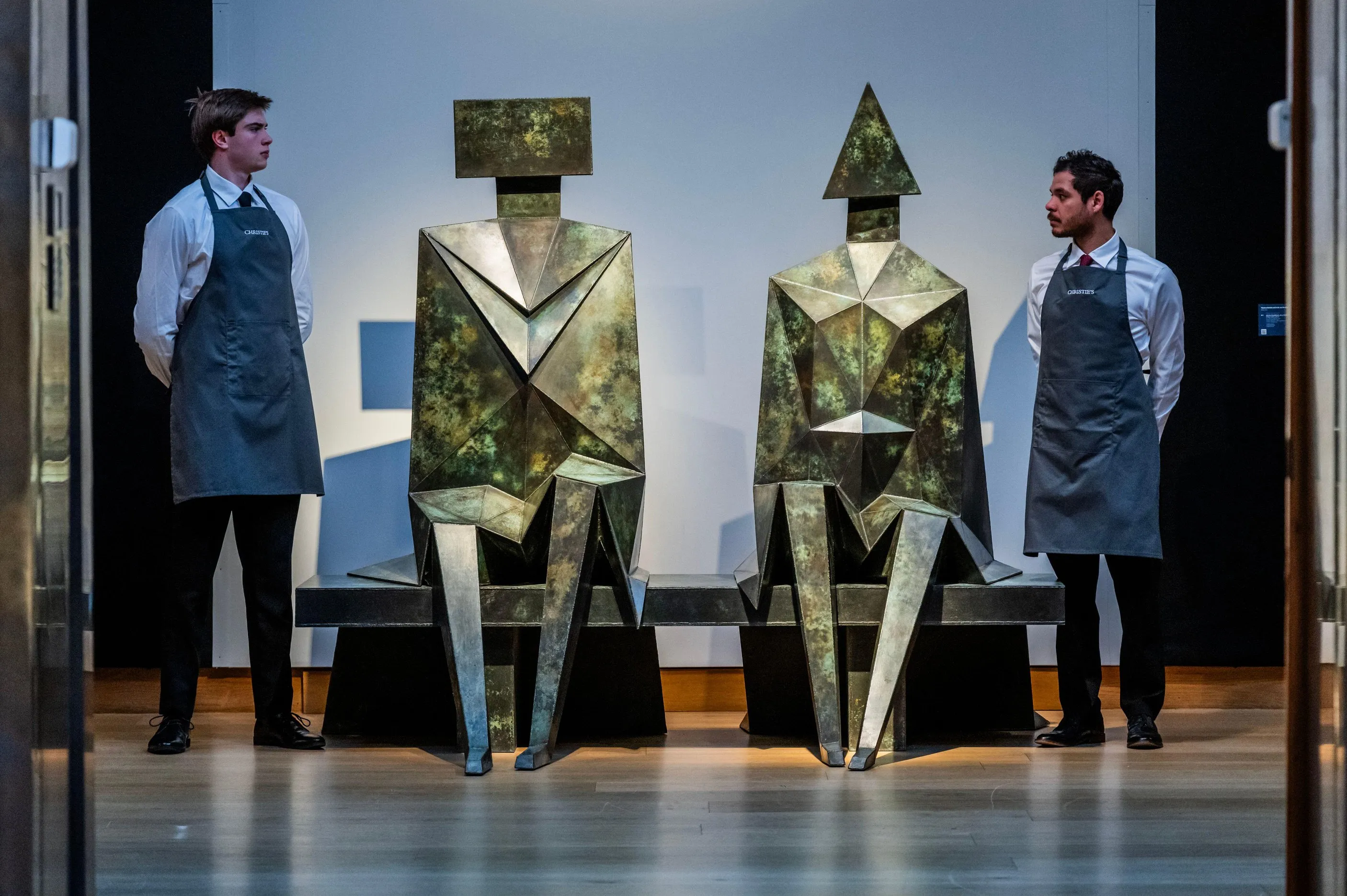 Assistants inspect Lynn Chadwick’s sculpture Sitting Couple on Bench (1990) in London on March 13, 2024, which is expected to fetch more than £1 million at auction. Christie’s says of the work: “Despite the jutting quality that has been used to render the figures, there is a tender intimacy between them”. (Photo by Guy Bell/Alamy Live News)