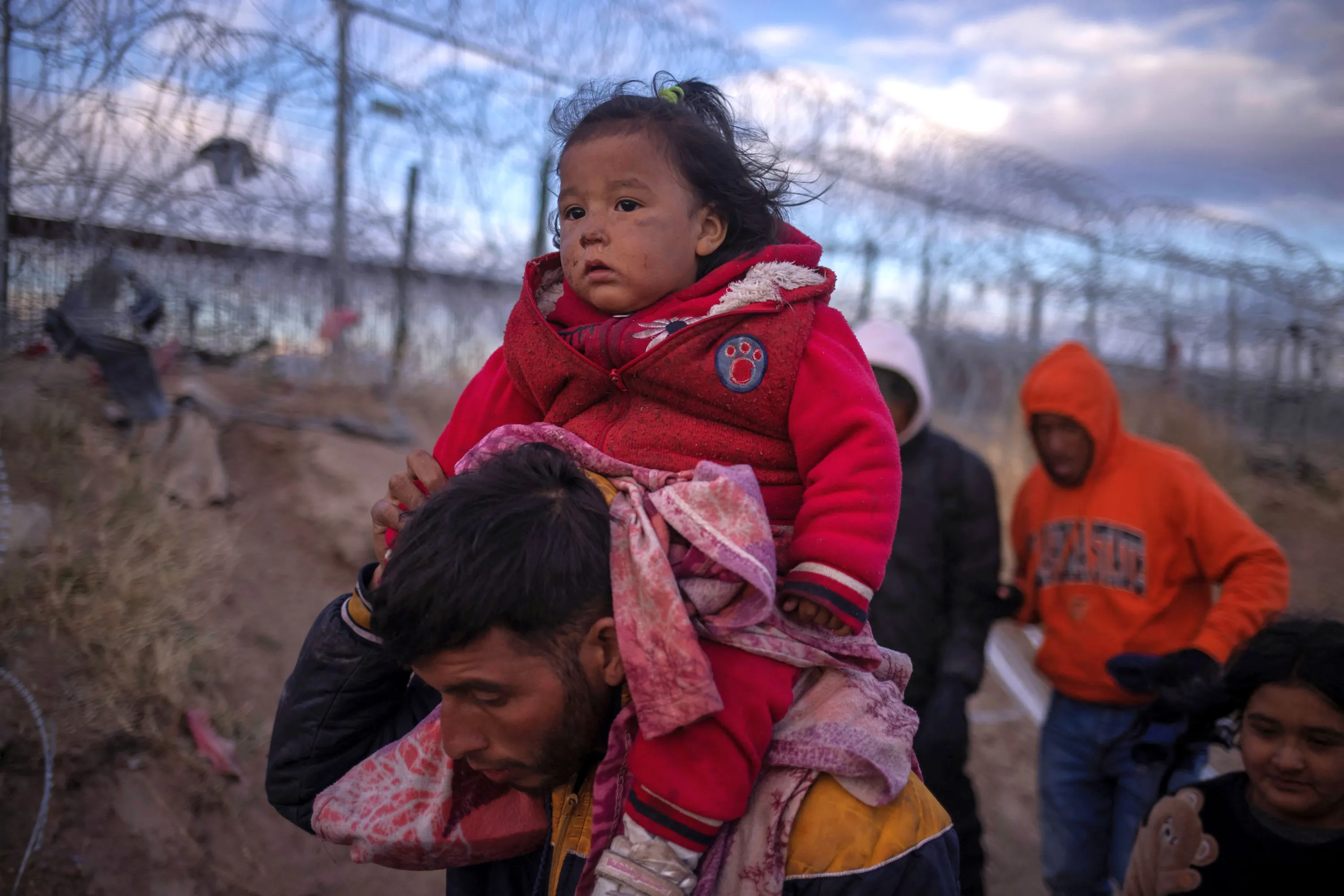 Briana, a one-year-old migrant girl from Peru, is carried by her father Jordan, as they search for an entry point into the United States past a razor wire-laden fence along the bank of the Rio Grande river in El Paso, Texas, U.S., March 26, 2024. (Photo by Adrees Latif/Reuters)