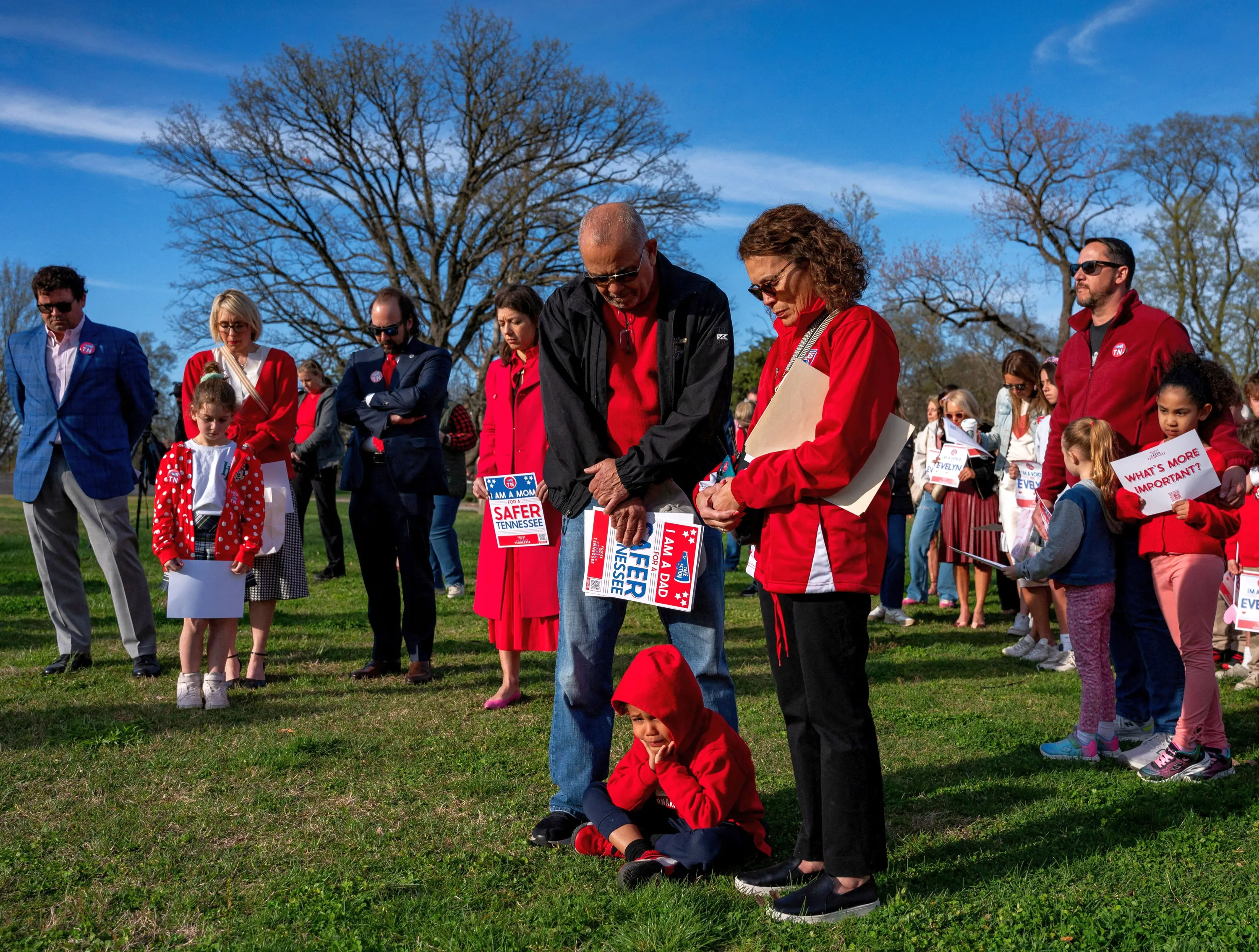 People hold a moment of silence to mark the one-year anniversary of the Covenant School shooting in Nashville, Tennessee on March 27, 2024. (Photo by Seth Herald/Reuters)