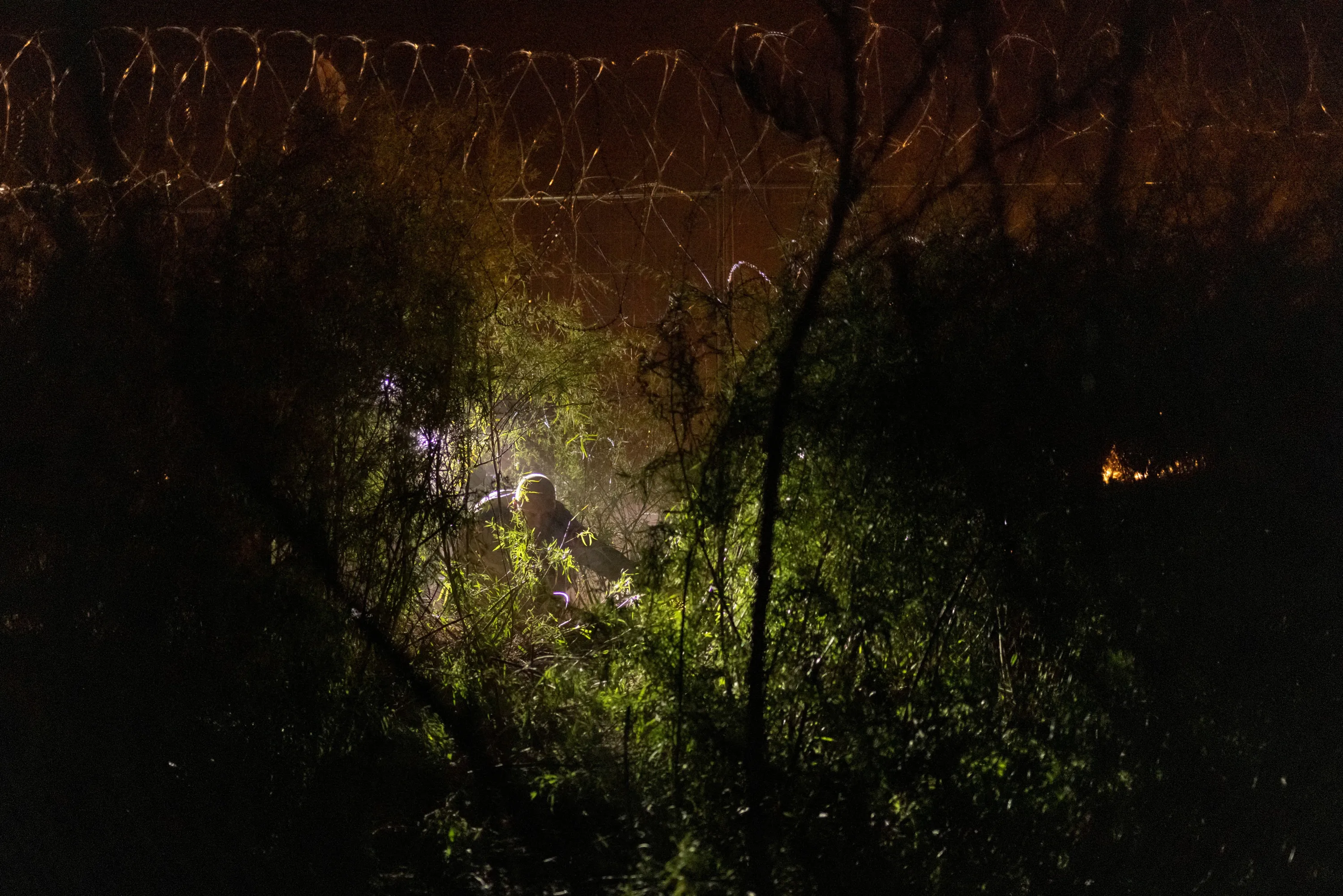 A Texas State Trooper surveys part of the razor wire-laden fence, erected to deter migrants after it was breached earlier along the bank of the Rio Grande river, in El Paso, Texas on March 28, 2024. (Photo by Adrees Latif/Reuters)