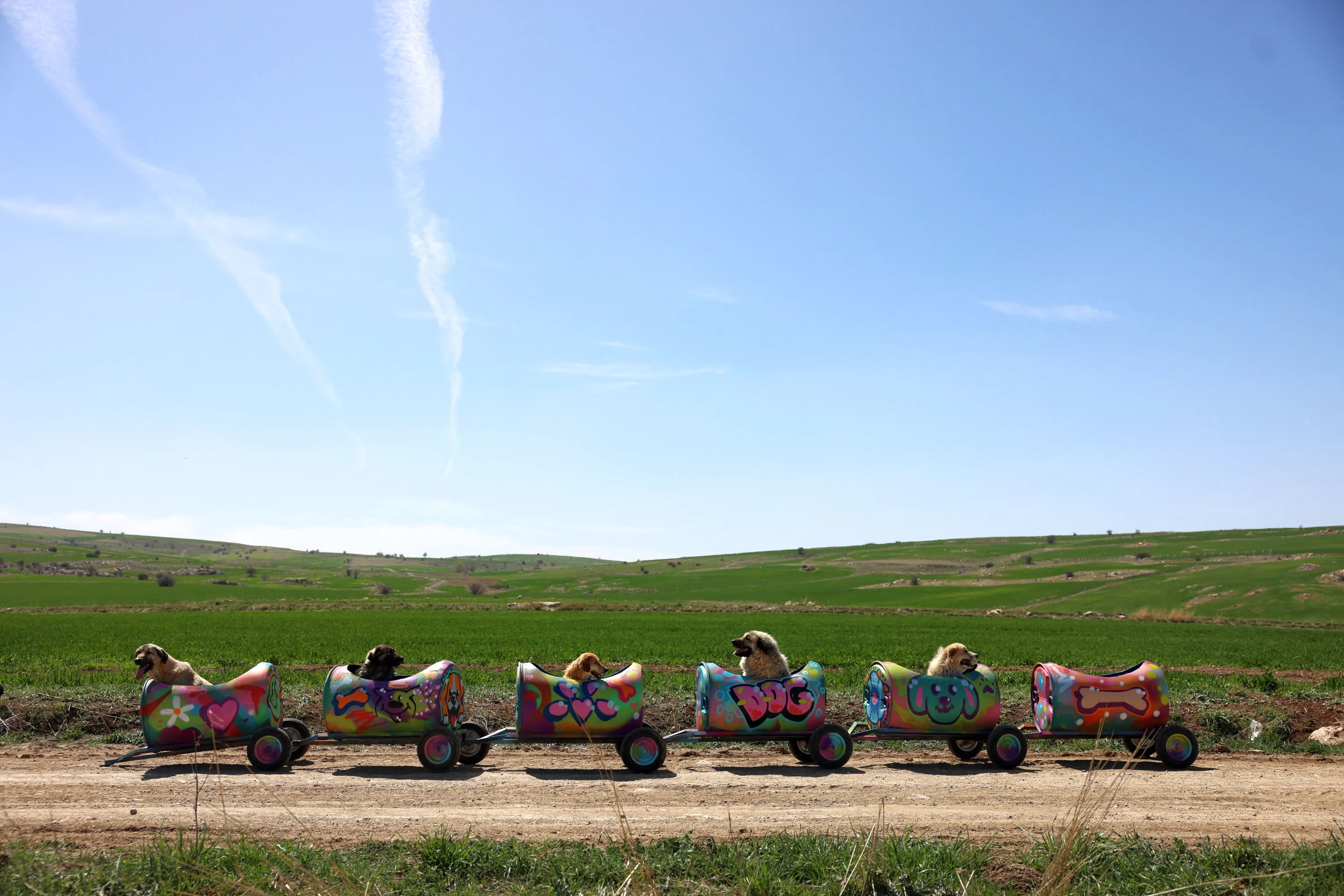 Disabled dogs are taken for a ride with a makeshift train at a shelter in Ankara, Turkey on April 4, 2024. (Photo by Cagla Gurdogan/Reuters)