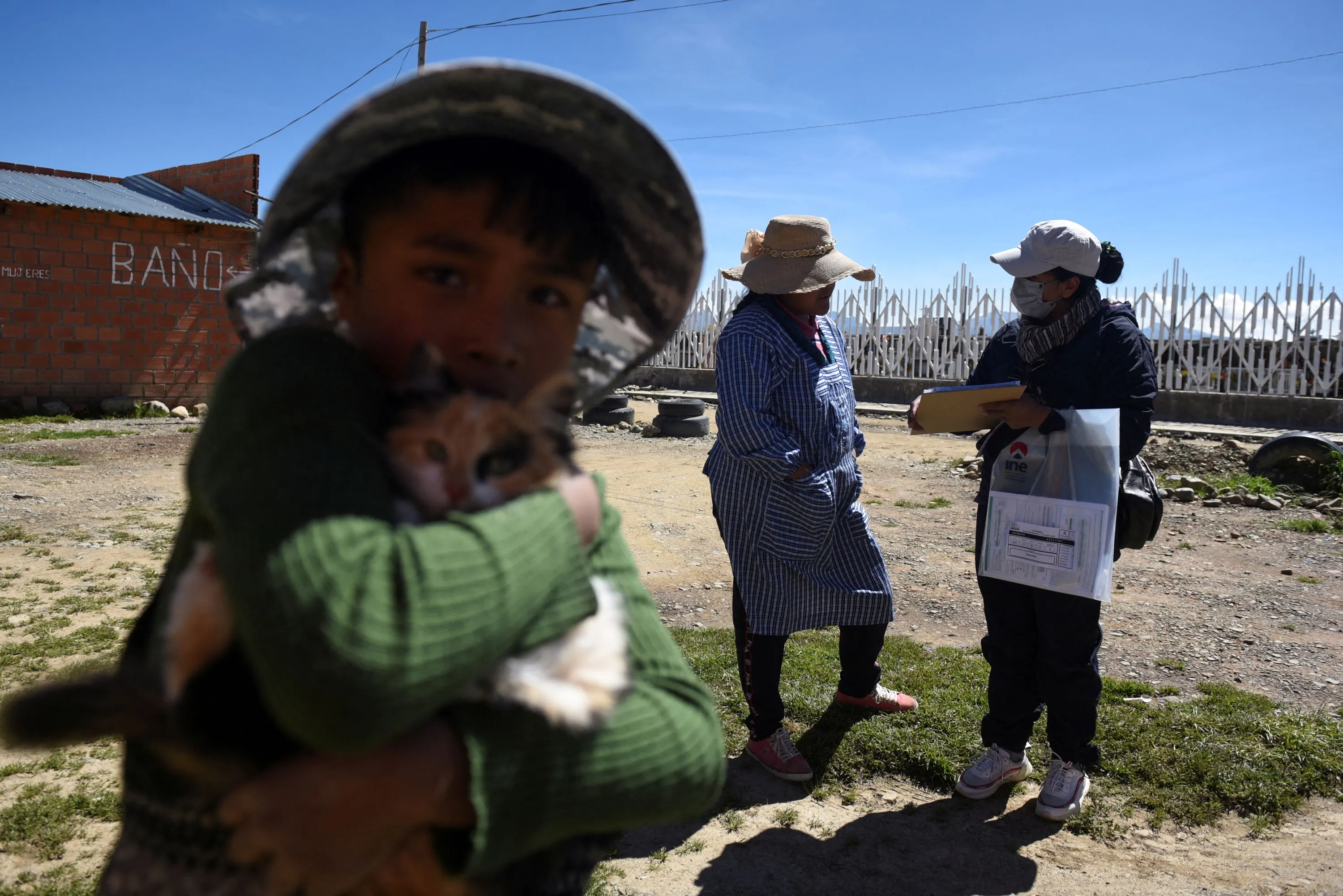 A child plays with a cat while his mother takes part in the National Population and Housing Census in the Mercedario area, in El Alto, Bolivia on March 23, 2024. (Photo by Claudia Morales/Reuters)