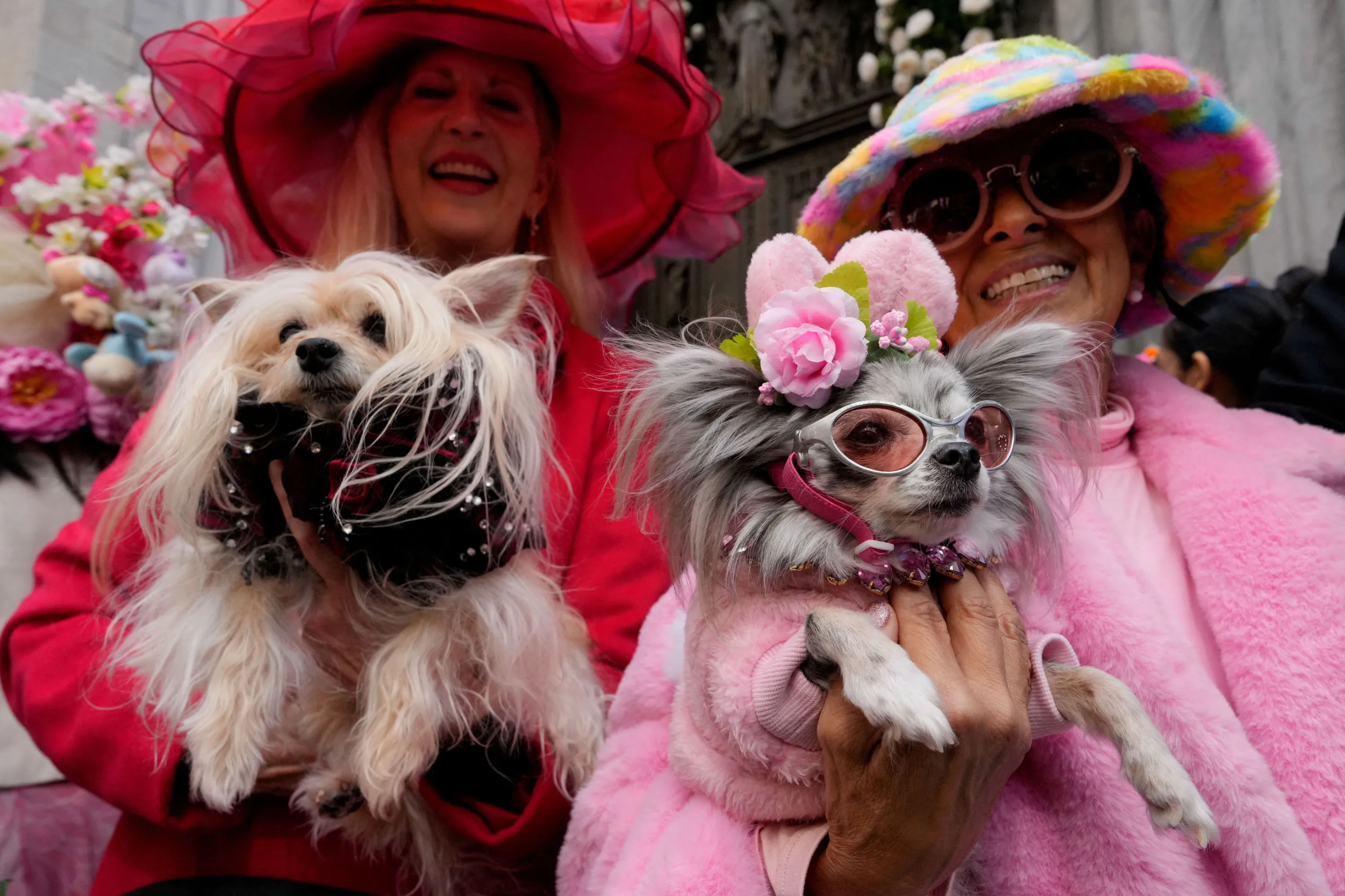 Leslie and her dog Puccini and Joanna and her dog Chichi Love take part in the annual Easter Parade and Bonnet Festival on 5th Avenue outside St. Patrick's Cathedral in Manhattan in New York City, U.S., March 31, 2024. (Photo by Adam Gray/Reuters)