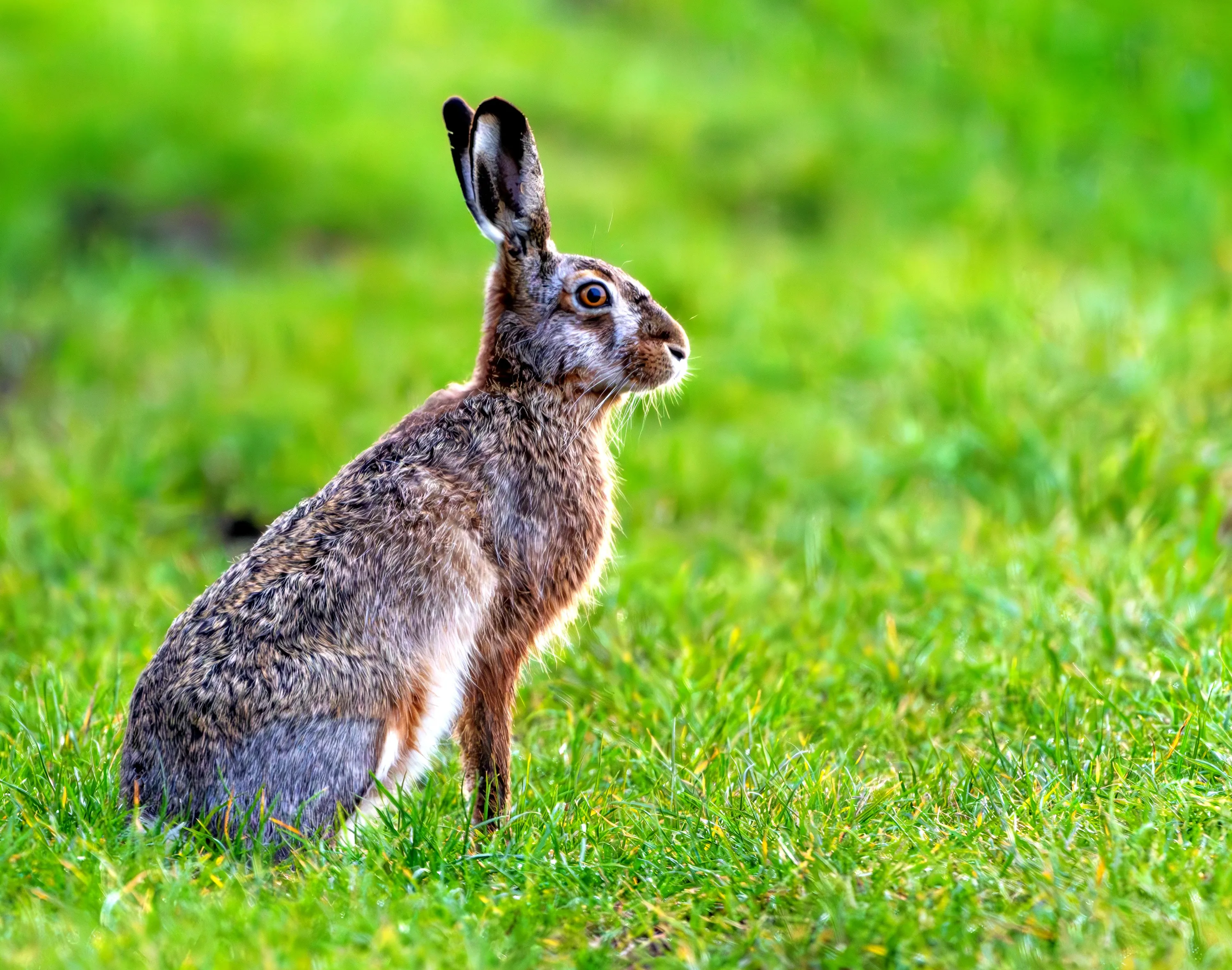 A European hare hops around Brandenberg, Germany on March 29, 2024. (Photo by Patrick Pleul/dpa)
