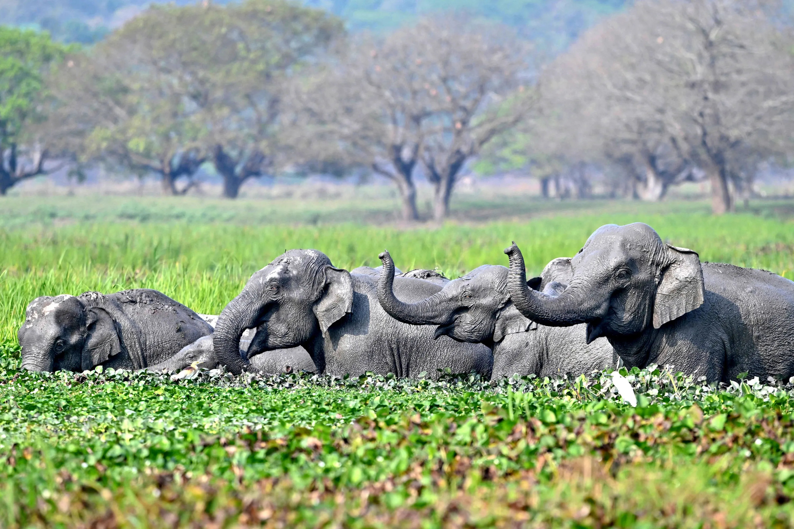 A herd of wild Asiatic elephants bathe at Khamrenga wetland in Thakurkuchi village, outskirts of Guwahati, April 1, 2024. (Photo by Biju Boro/AFP Photo)
