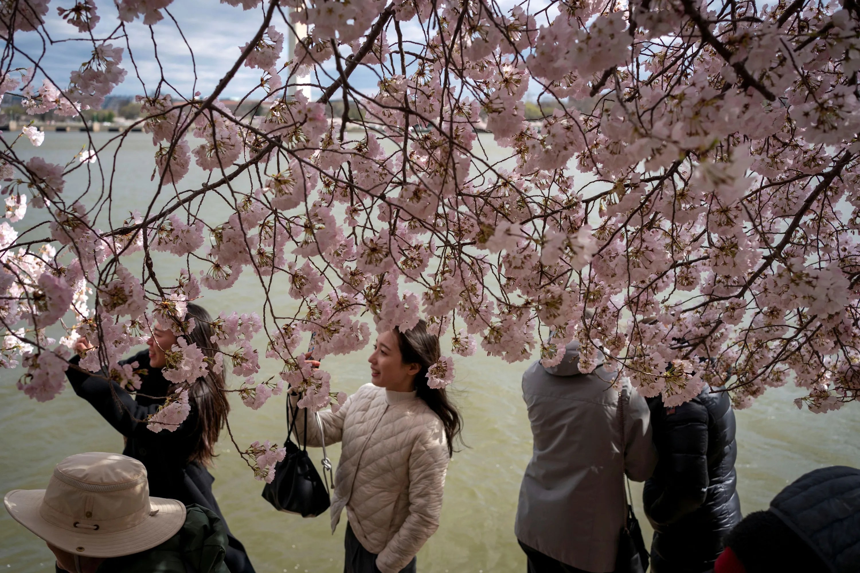Visitors take pictures beneath the cherry blossoms along the Tidal Basin in Washington, on March 19, 2024. (Photo by Bonnie Cash/Reuters)