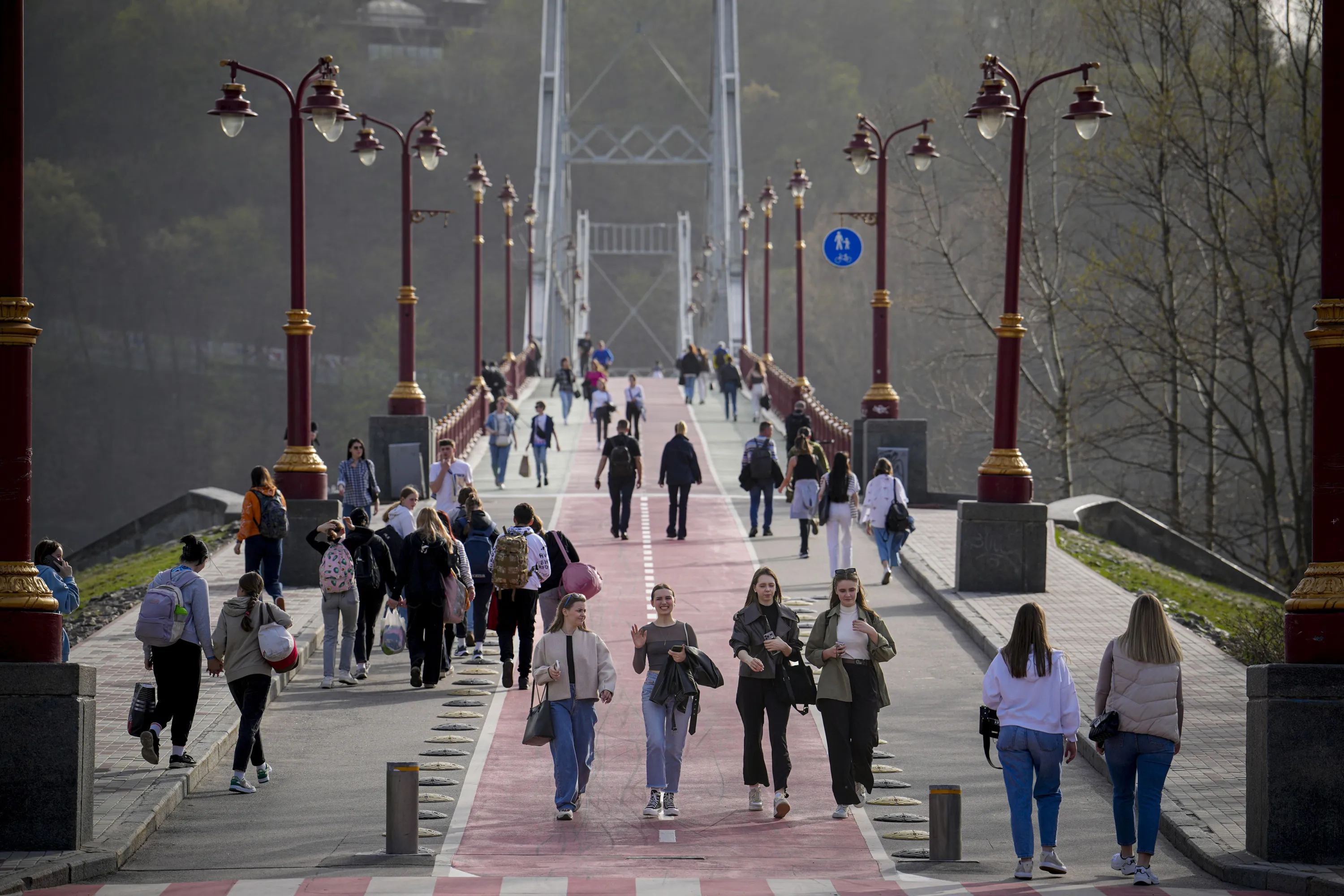 People cross a bridge on a warm afternoon on the bank of the Dniepr River in Kyiv, Ukraine, Tuesday, April 2, 2024. (Photo by Vadim Ghirda/AP Photo)