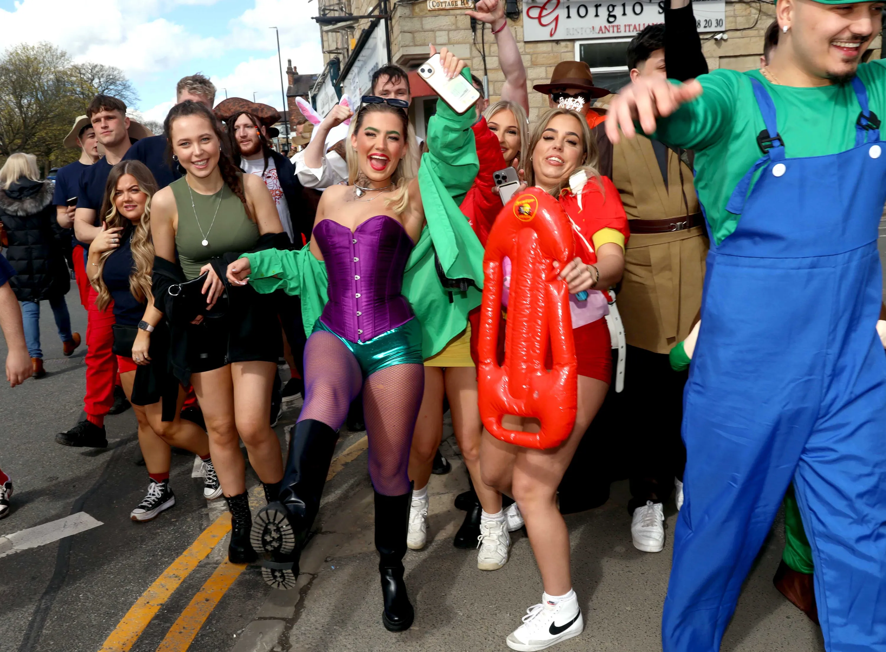 Boozed-out revellers donned fancy dress as they welcomed in the Bank Holiday at the Otley Run. Hundreds swarmed Leeds, UK on Saturday, March 30, 2024, as the infamous tipple mission got underway beneath blue skies and sunshine. (Photo by NB Press LTD)