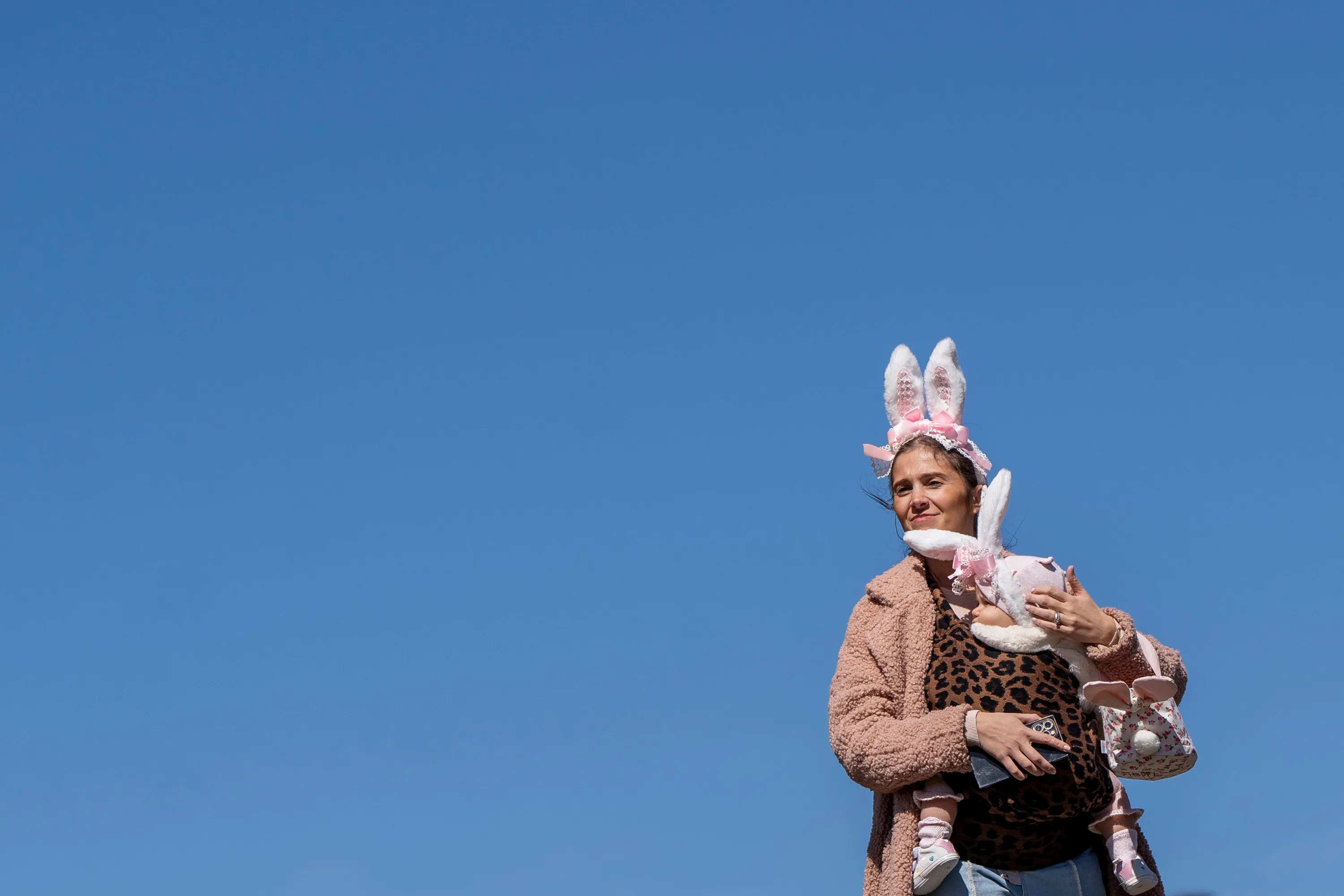 Ankelena Mahmuti and her daughter Nolita Mahmuti wear bunny ears during the Easter egg hunt at Parsons Pond Park in Franklin Lakes, N.J. on March 30, 2024. (Photo by Anne-Marie Caruso/USA Today Network)