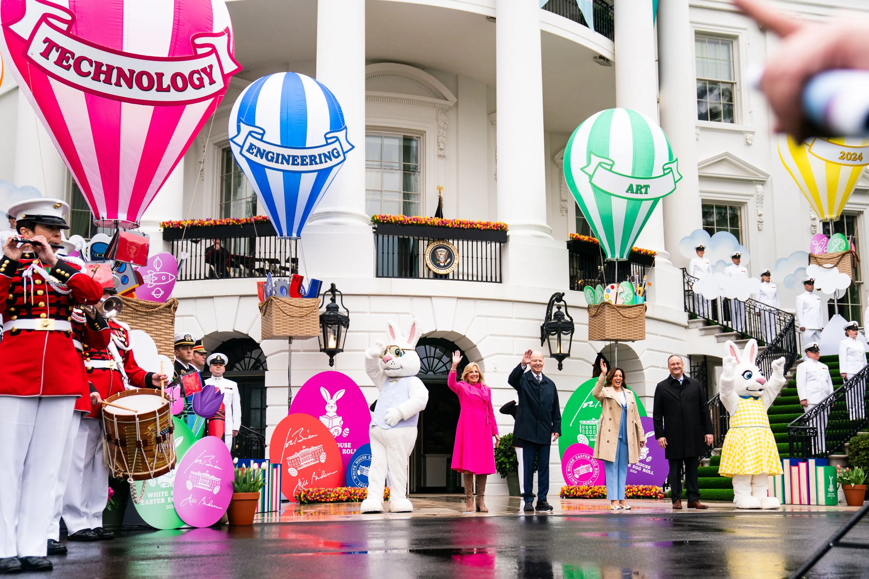 President Joe Biden, First Lady Dr. Jill Biden, Vice President Kamala Harris and Second Gentlemen Douglas Emhoff during the 2024 White House Easter Egg Roll on the South Lawn of the White House, Monday, April 1, 2024. (Photo by Demetrius Freeman/The Washington Post)