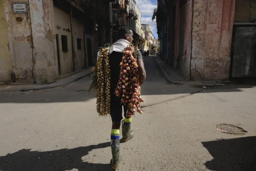A street vendor walks through Old Havana selling onions and garlic, in Havana, Cuba, Wednesday, January 31, 2024. (Photo by Ramon Espinosa/AP Photo)