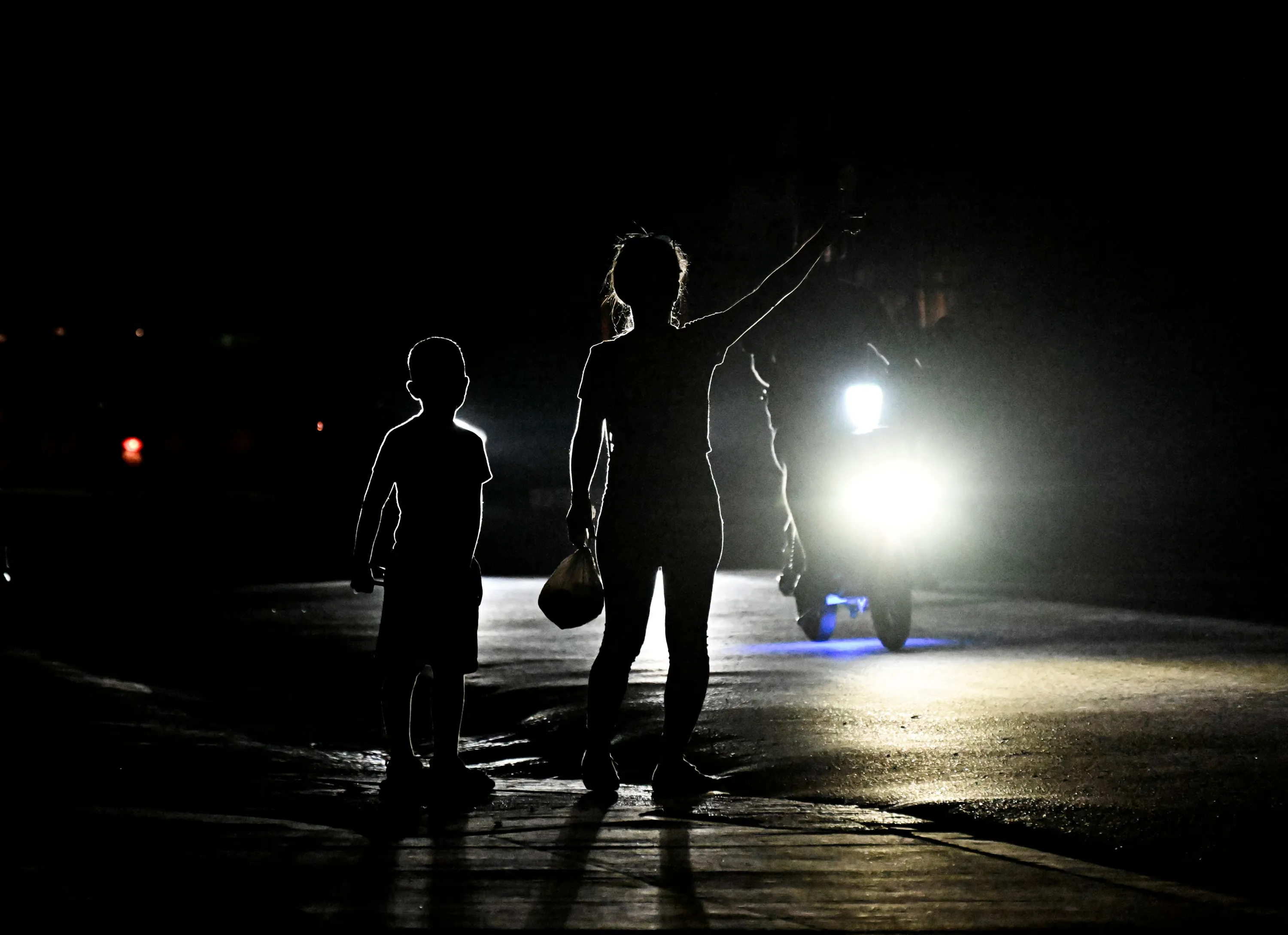 A woman with her son signals a car on a dark street during a blackout in Bauta municipality, Artemisa province, Cuba, on March 18, 2024. (Photo by Yamil Lage/AFP Photo)