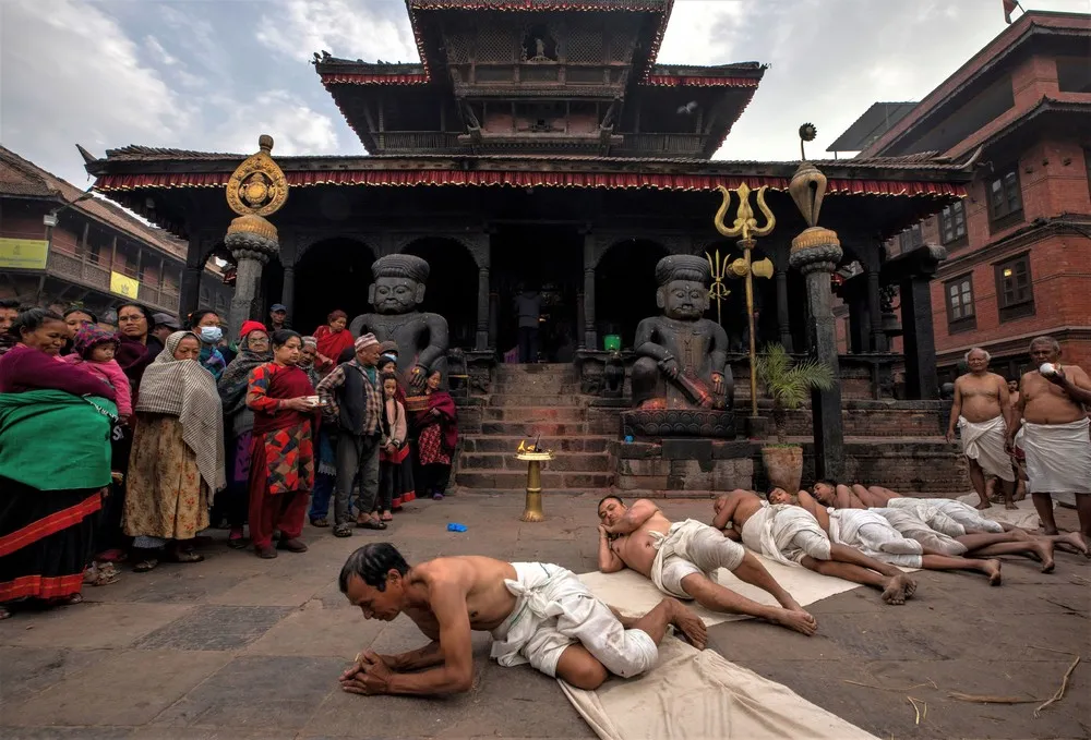 Nepalese Hindu devotees roll on the ground during the month long Madhav Narayan festival in Bhaktapur, Nepal, 26 January 2023. The Madhav Narayan festival takes place for a full month and is devoted to religious fasting, holy bathing and the study of the Swasthani book, a chapter or story of which is read each evening by priests or heads of households to the gathered family. Thousands of married women and dozens of male devotees concluded their month-long fast for a better life and peace in the country at various temples. According the Swasthani book, whoever takes the month long Swasthani fast, all their sins will be forgiven and they will not experience bad days during their life. The festival is dedicated to Lord Shiva, the god of creation and destruction. (Photo by Narendra Shrestha/EPA/EFE)