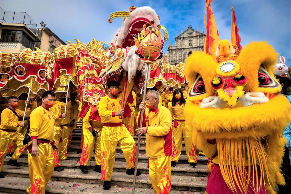 Performers get ready at start of the dragon dance during celebrations on the first day of the Chinese lunar new year in Macau on January 22, 2023. (Photo by Eduardo Leal/AFP Photo)