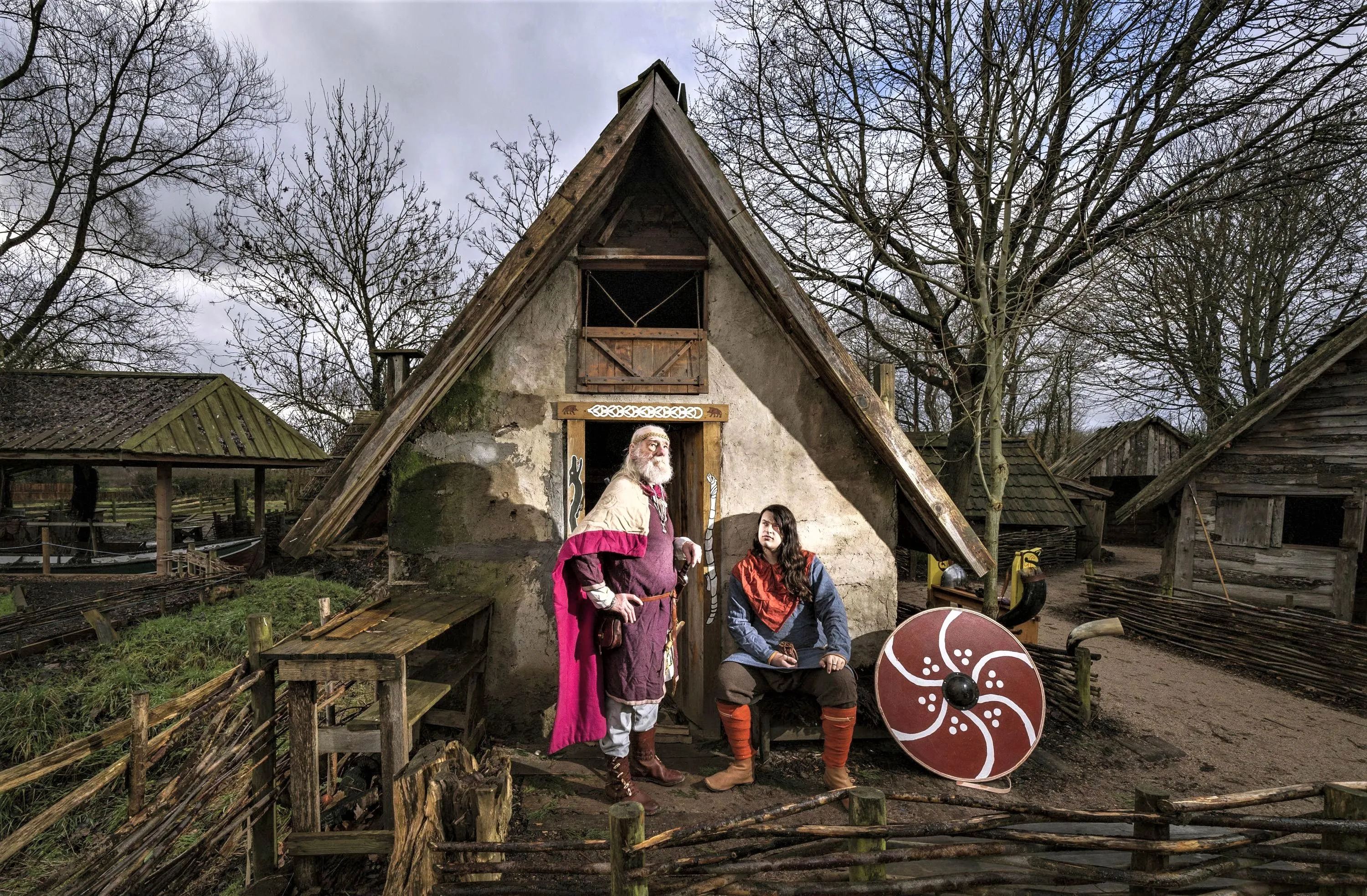 Gordon Monks (left) and Matthew Holmes (right), members of living history group the Danelaw Villagers during a demonstration on Saturday, January 14, 2023 at Murton Park living museum in York of Viking daily life as it would have been lived over a thousand years ago. (Photo by Danny Lawson/PA Images via Getty Images)