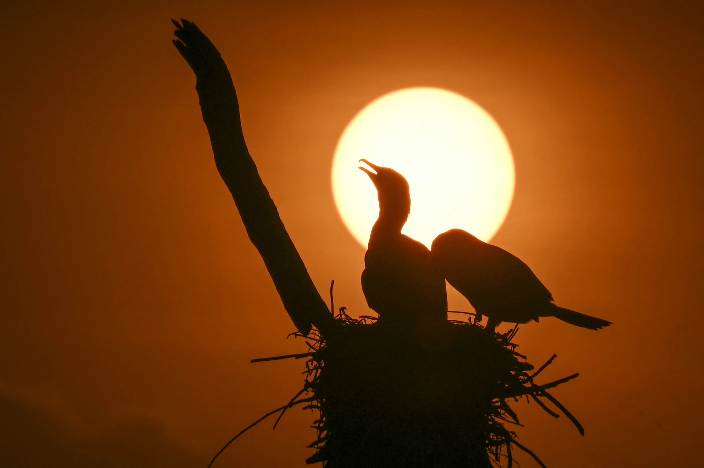 Great cormorants rest in a nest as the sun sets at Sankey Tank Lake in Bengaluru, India on March 4, 2024. (Photo by Idrees Mohammed/AFP Photo)