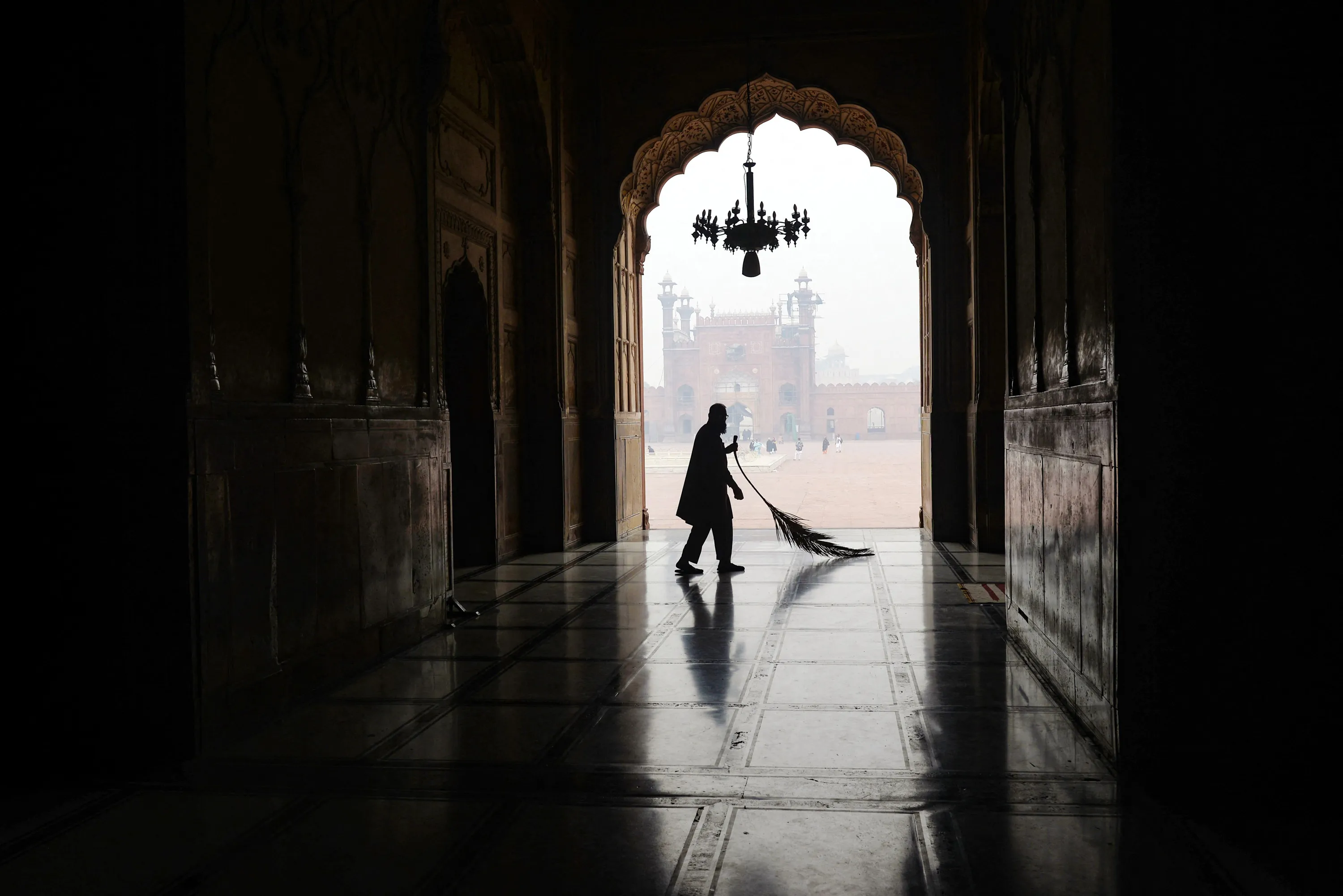 A Muslim man cleans a corridor at Badshahi mosque ahead of the Islamic holy fasting month of Ramadan in Lahore on March 11, 2024. (Photo by Syed Murtaza/AFP Photo)