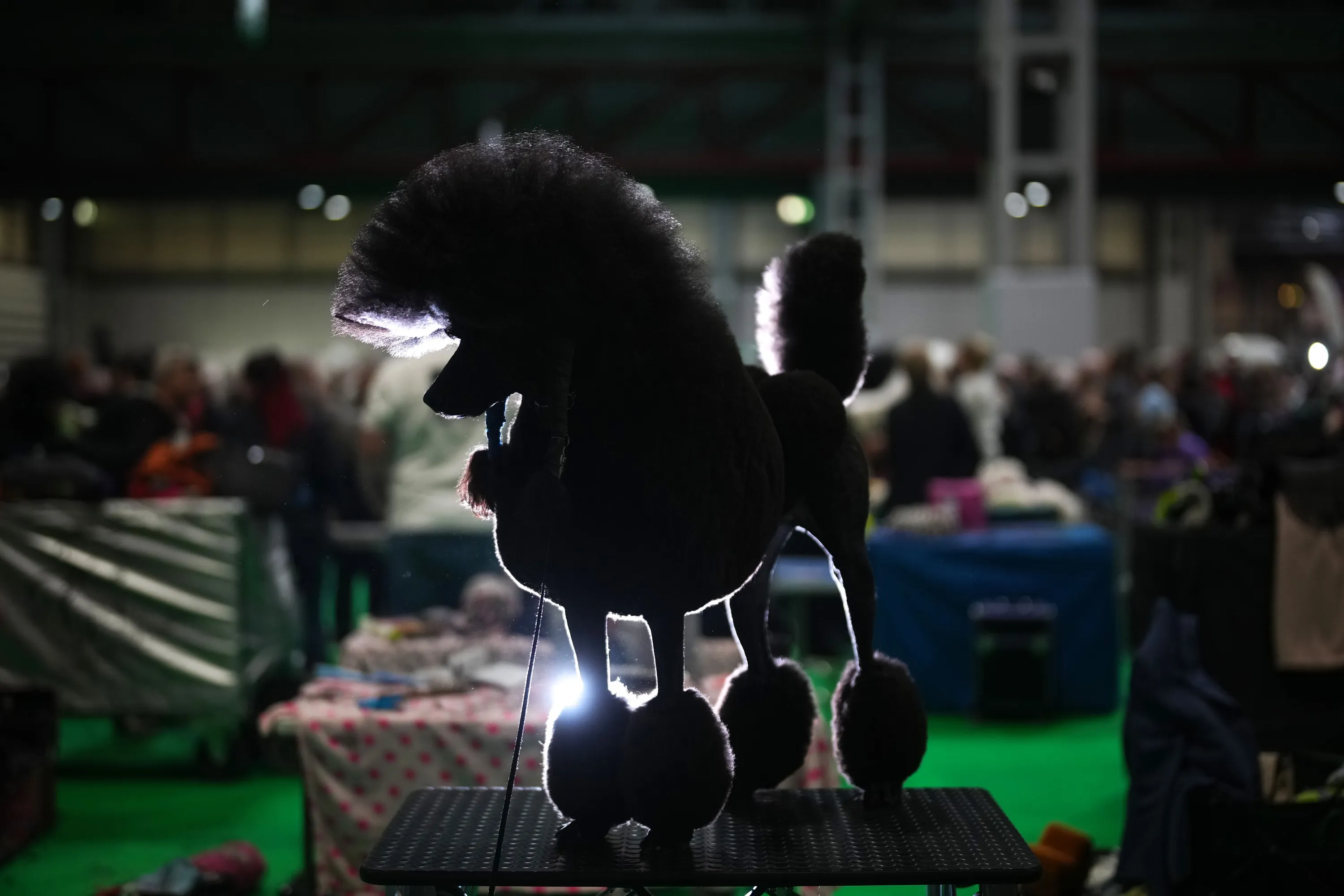 A Standard Poodle named Mortis waits patiently to enter the judging ring at the National Exhibition Centre on March 07, 2024 in Birmingham, England. Over 24,000 dogs from 220 different breeds take part in Crufts 2024 with hundreds of the most agile and athletic dogs competing in different competitions including agility and flyball and, new for this year, Hoopers - a low-impact and inclusive activity for dogs and owners. The event culminates in the Best in Show 2024 trophy, awarded on Sunday night. (Photo by Christopher Furlong/Getty Images)