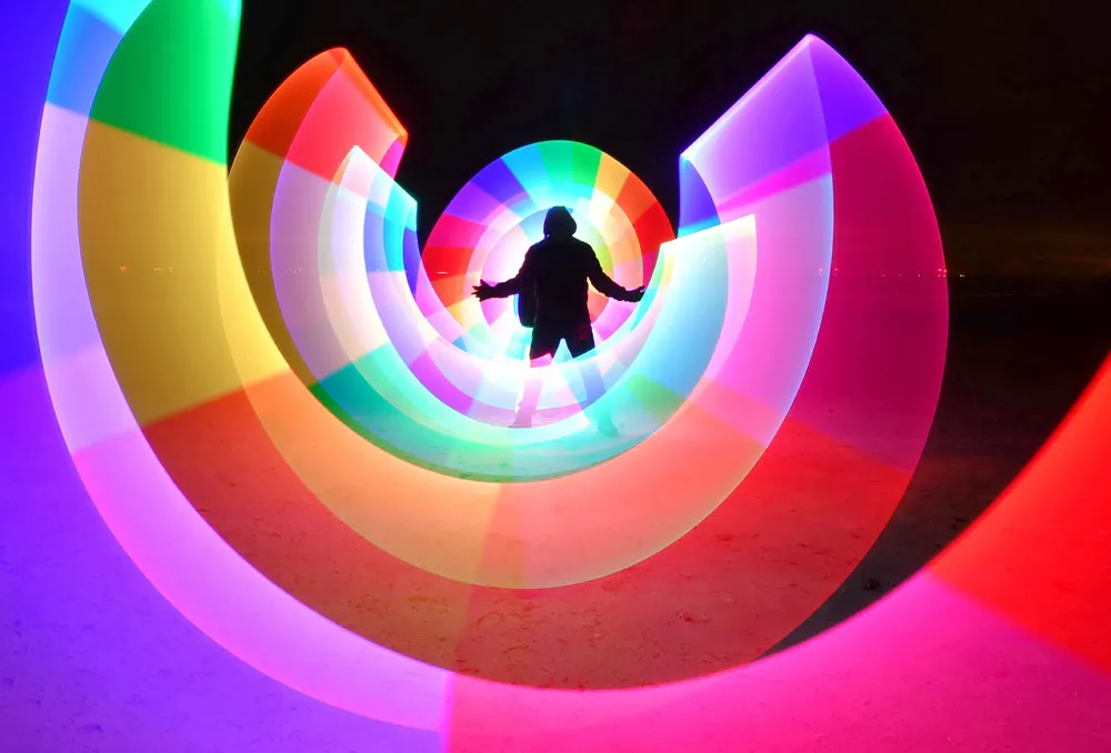 Kevin Jay and Nigel Cox perform some light painting on the beach at Frinton-on-Sea in Essex, UK using colour changing LED light wands during a 25-second exposure on March 4, 2024. (Photo by Kevin Jay/Picture Exclusive)