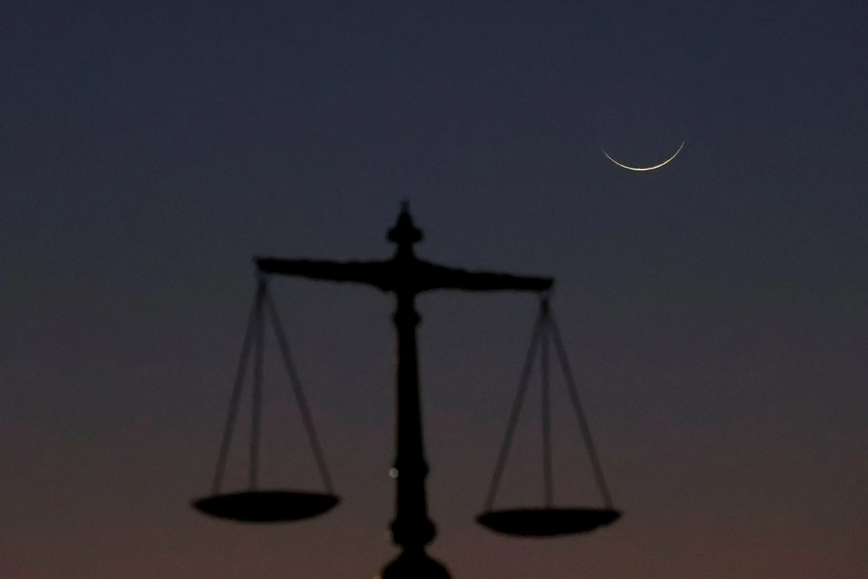 A crescent moon is seen with a monument of balance scale at the Sindh High Court premises, as Muslims attend an evening prayer session called “Tarawih” to mark the holy fasting month of Ramadan in Karachi, Pakistan on March 11, 2024. (Photo by Akhtar Soomro/Reuters)