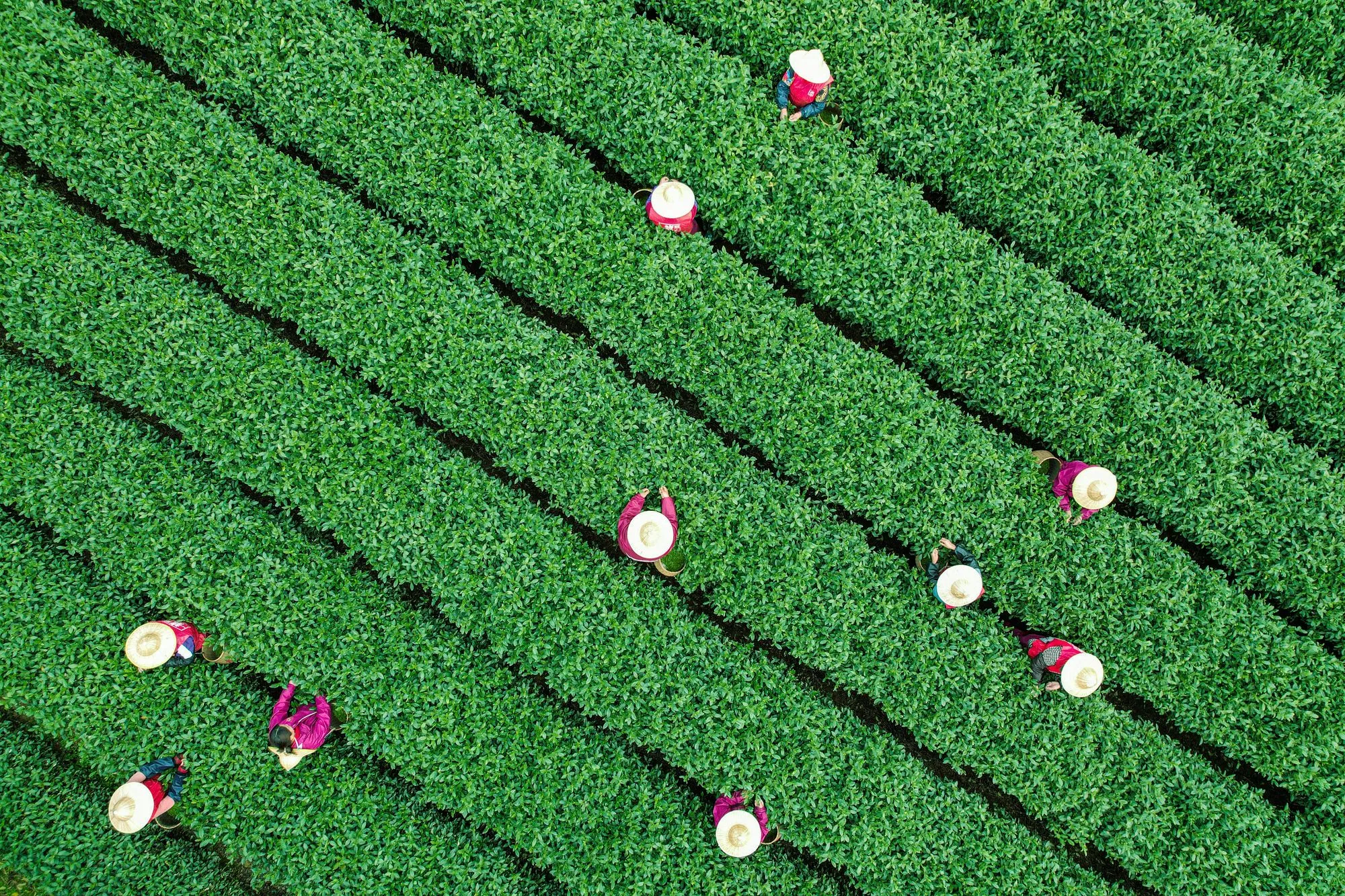 Workers pick tea leaves at a tea field in Hangzhou, in eastern China's Zhejiang province on March 26, 2024. (Photo by AFP Photo/China Stringer Network)