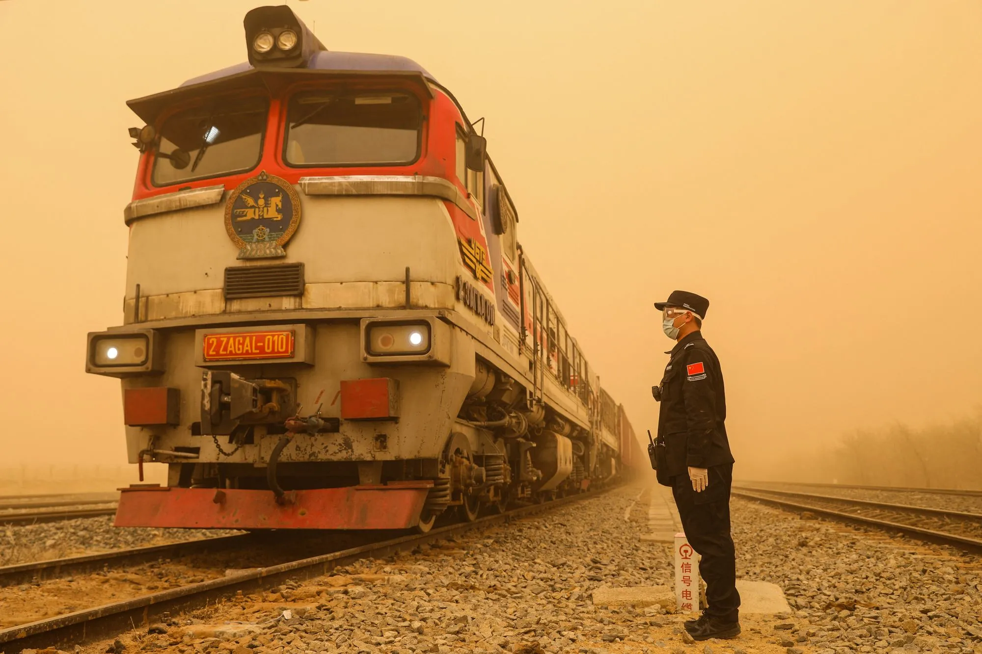 This photo taken on March 27, 2024 shows a police officer standing guard at a border checkpoint during a sandstorm in Erenhot, in northern China's Inner Mongolia autonomous region. (Photo by AFP Photo/China Stringer Network)