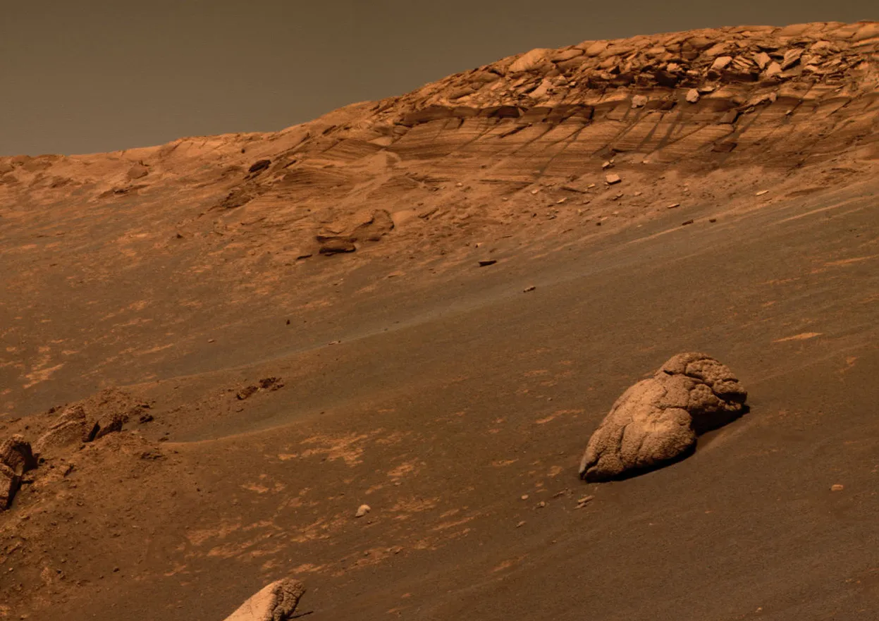 An image taken by Opportunity on October 7, 2004, shows a bizarre, lumpy rock informally named Wopmay on the lower slopes of Endurance Crater. Scientists believe the lumps in Wopmay were formed by one of two processes. Either they were caused by the impact that created the football field-sized crater, or they arose when water soaking the rock dried up. (Photo by AP Photo/NASA via The Atlantic)