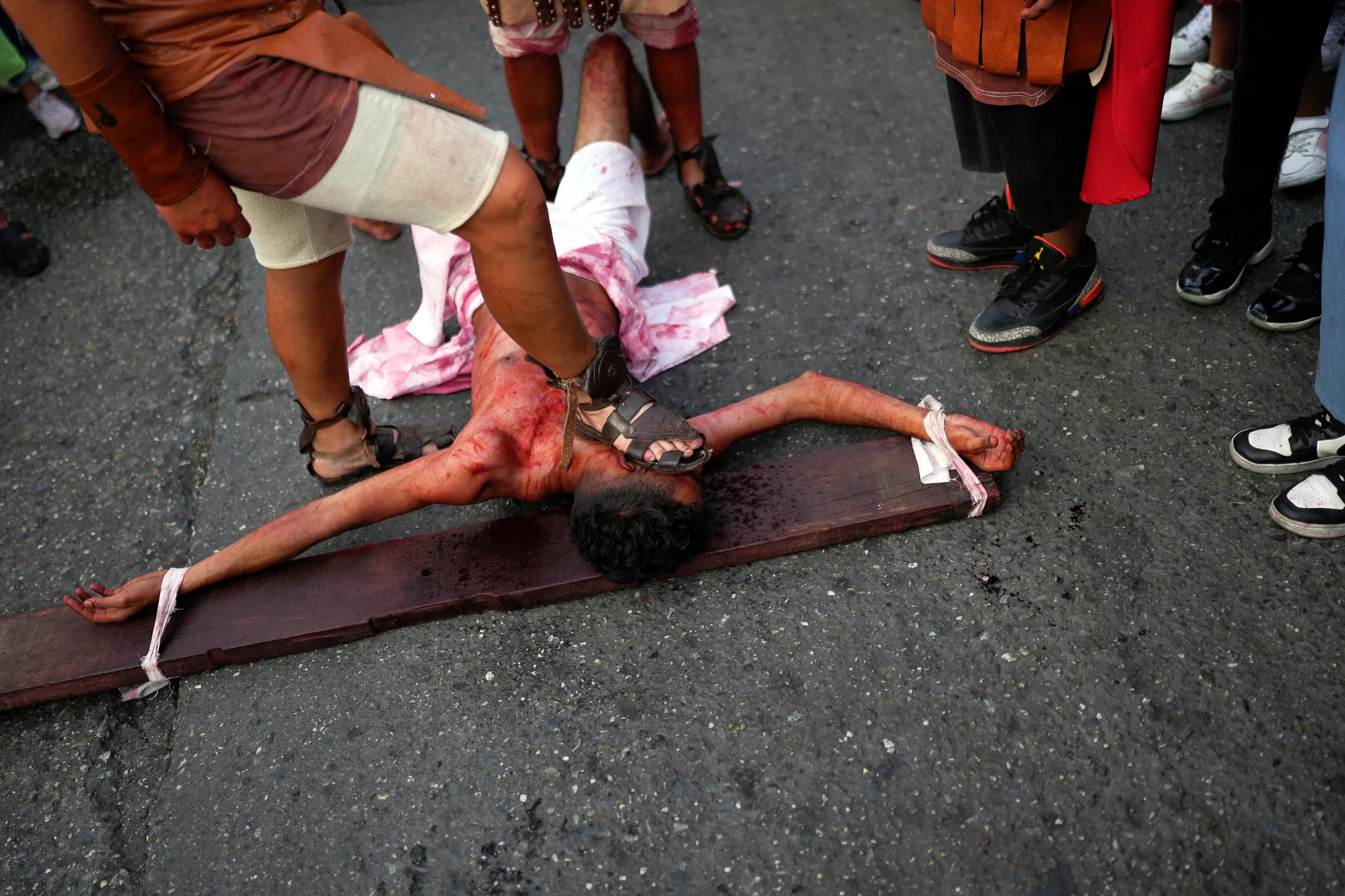 A devotee dressed as a Roman soldier places his foot on the face of penitent playing the role of one of two thieves sentenced to be crucified alongside Jesus Christ, during a Way of the Cross reenactment, as part of Holy Week celebrations in the Petare neighborhood of Caracas, Venezuela, Friday, March 29, 2024. Holy Week commemorates the last week of the earthly life of Jesus Christ culminating in his crucifixion on Good Friday and his resurrection on Easter Sunday. (Photo by Matias Delacroix/AP Photo)