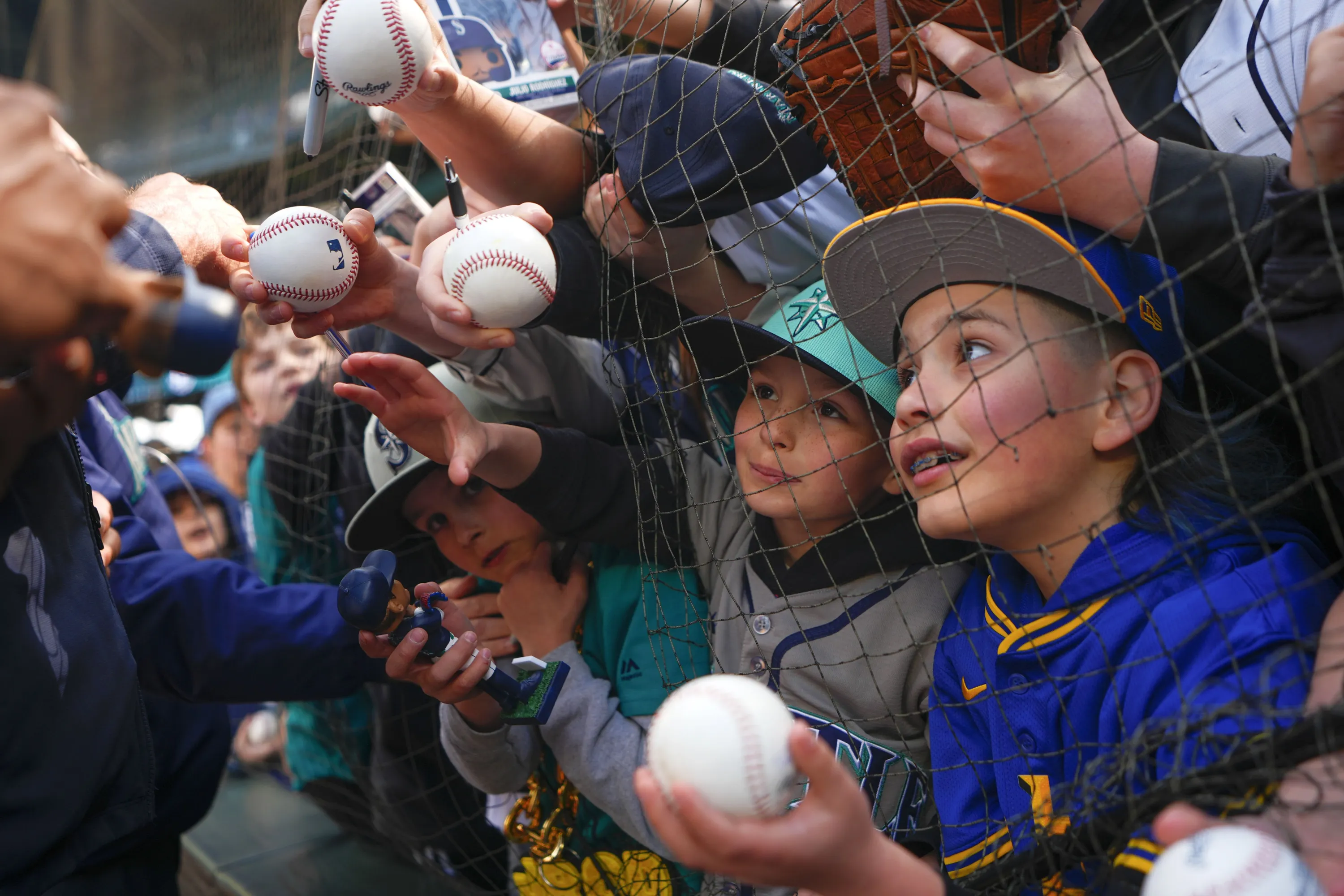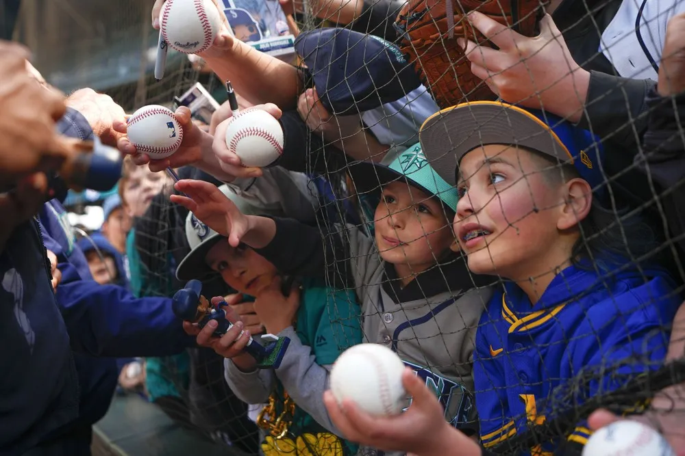 Fans vie for an autograph from Seattle Mariners center fielder Julio Rodríguez before a baseball game between the Mariners and the Cleveland Guardians, Wednesday, April 3, 2024, in Seattle. (Photo by Lindsey Wasson/AP Photo)