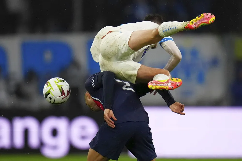 Marseille's Quentin Merlin jumps over PSG's Achraf Hakimi during the French League One soccer match between Marseille and Paris at the Velodrome stadium in Marseille, south of France, Sunday, March 31, 2024. (Photo by Daniel Cole/AP Photo)