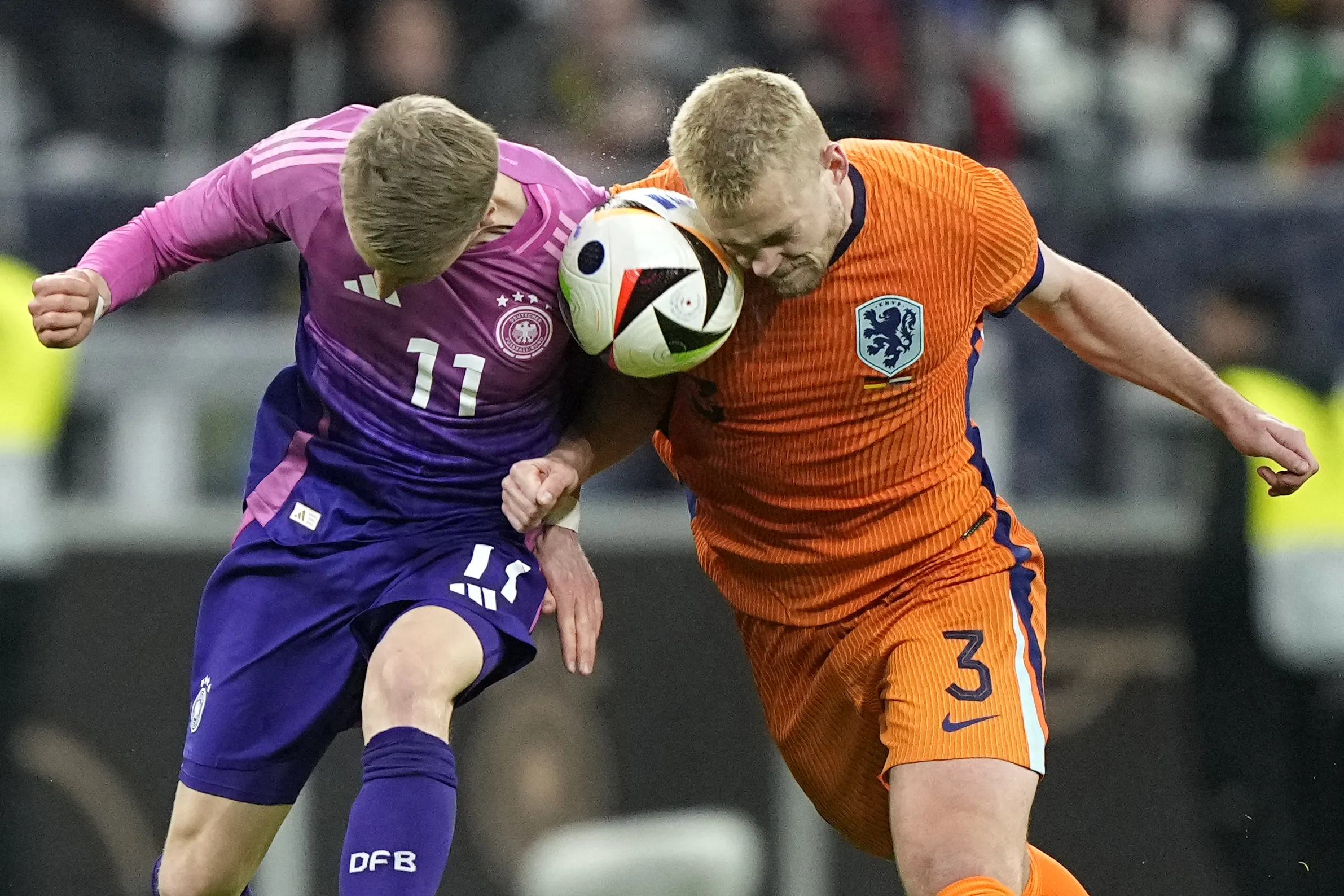Netherlands' Matthijs de Ligt, right, challenges Germany's Chris Führich during the international friendly soccer match between Germany and Netherlands at the Deutsche Bank Park in Frankfurt, Germany on Tuesday, March 26, 2024. (Photo by Martin Meissner/AP Photo)