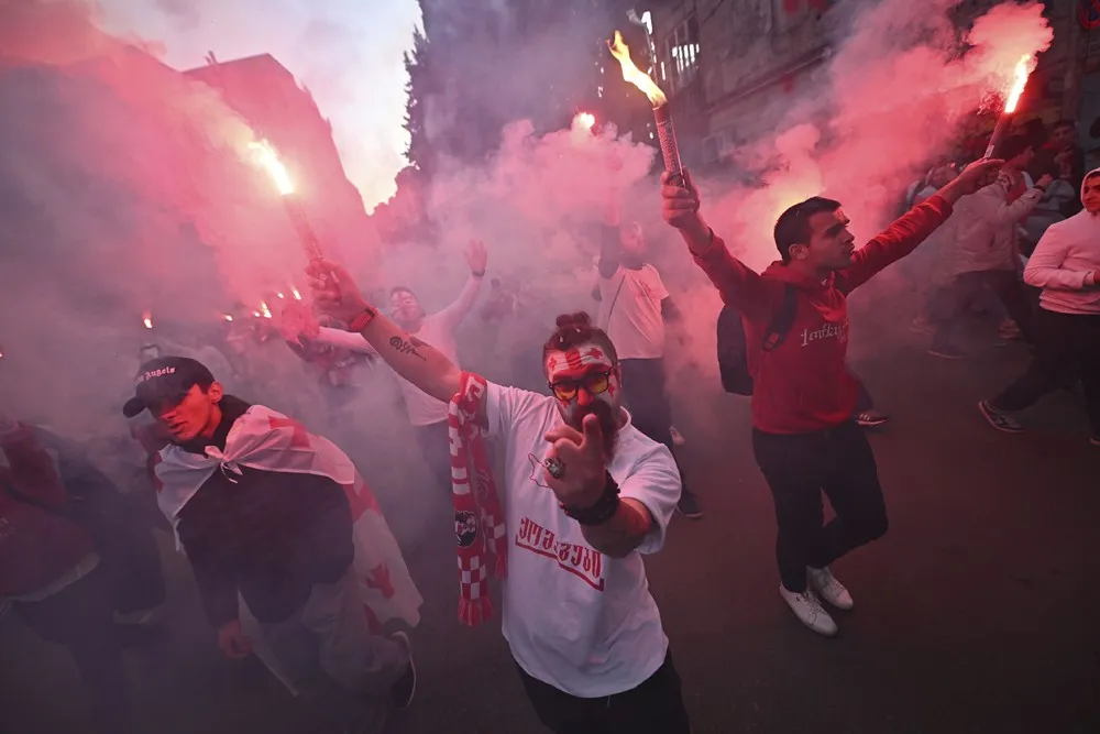 Georgia's fans walk to the stadium prior to the Euro 2024 qualifying play-off soccer match between Georgia and Greece at the Boris Paichadze National Stadium in Tbilisi, Georgia, Tuesday, March 26, 2024. (Photo by Tamuna Kulumbegashvili/AP Photo)