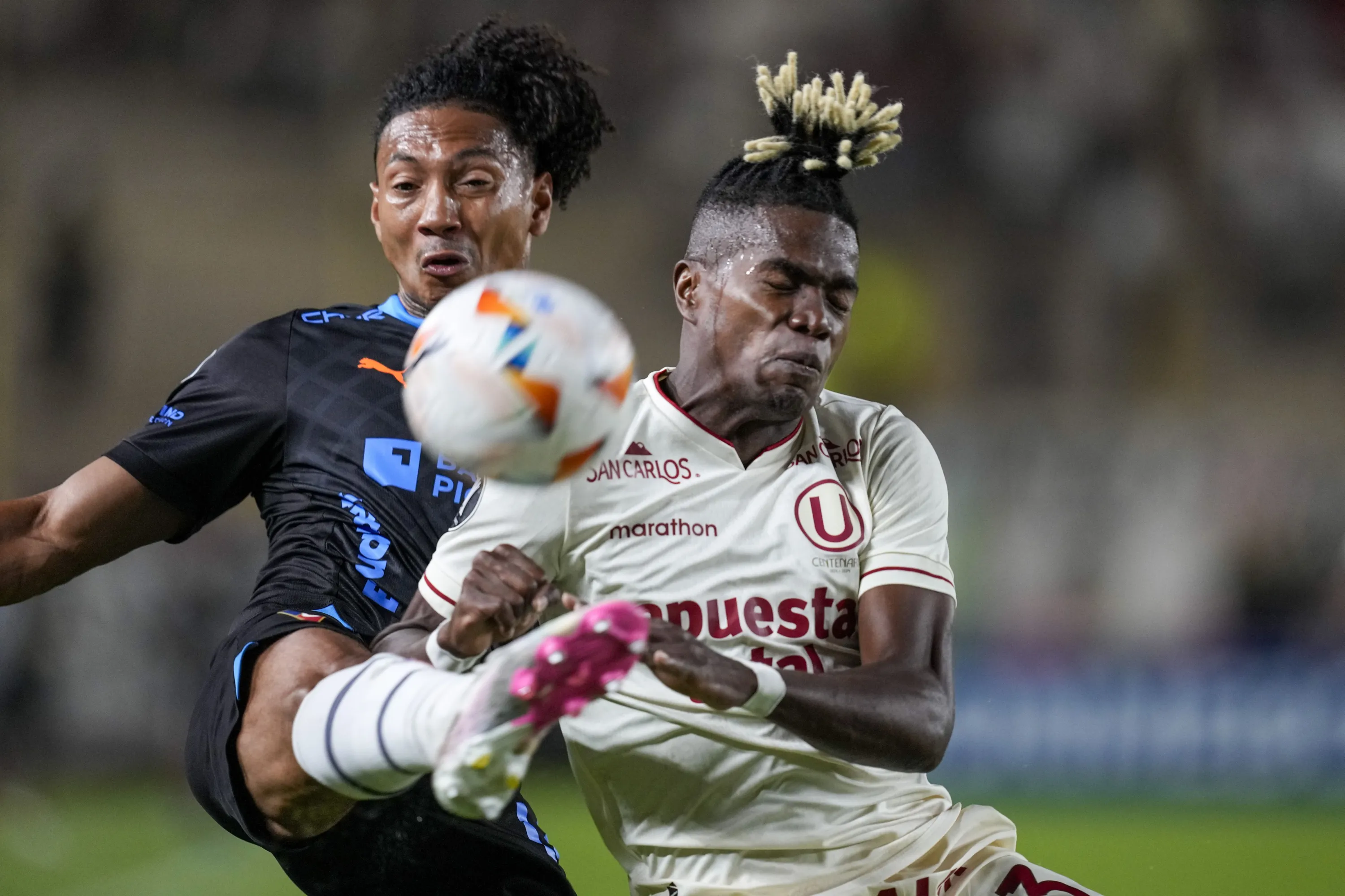 Jose Quintero of Ecuador's Liga Deportiva Universitaria, left, and Segundo Portocarrero of Peru's Universitario battle for the ball during a Copa Libertadores Group D soccer match at Monumental stadium in Lima, Peru, Tuesday, April 2, 2024. (Photo by Martin Mejia/AP Photo)