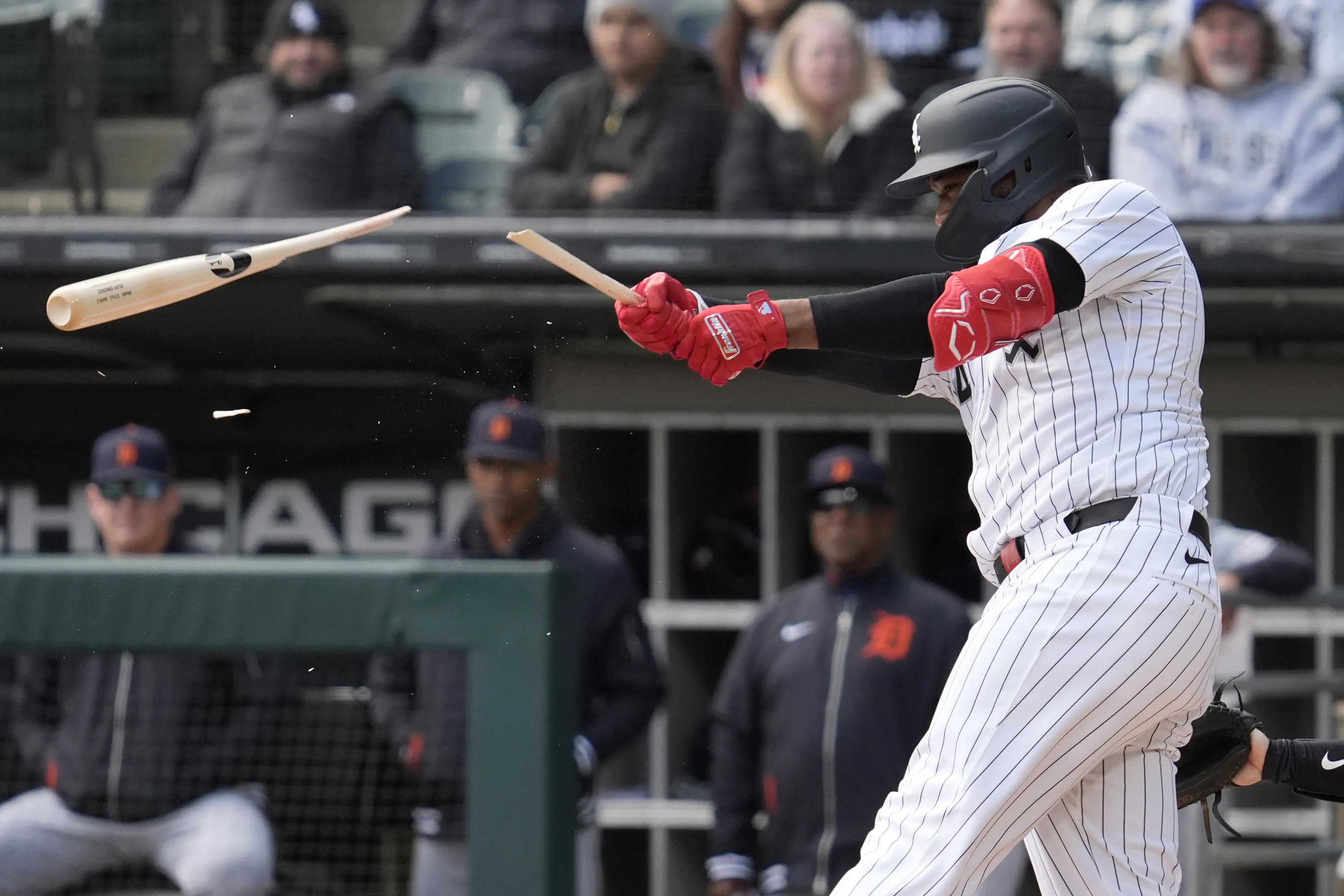 Chicago White Sox's Eloy Jimenez breaks his bat as he grounds out during the first inning of a baseball game against the Detroit Tigers in Chicago, Sunday, March 31, 2024. (Photo by Nam Y. Huh/AP Photo)